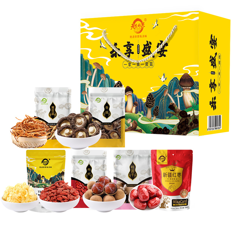 彩盒尺寸:400*180*300mm 产品规格:1244克(6袋装) 内配: 1.天生好果新疆红枣500克 2.天生好果果黄花菜88克 3.天生好果香菇68克 4.天生好果枸杞100克 5.天生好果银耳58克 6.天生好果桂圆干 450克