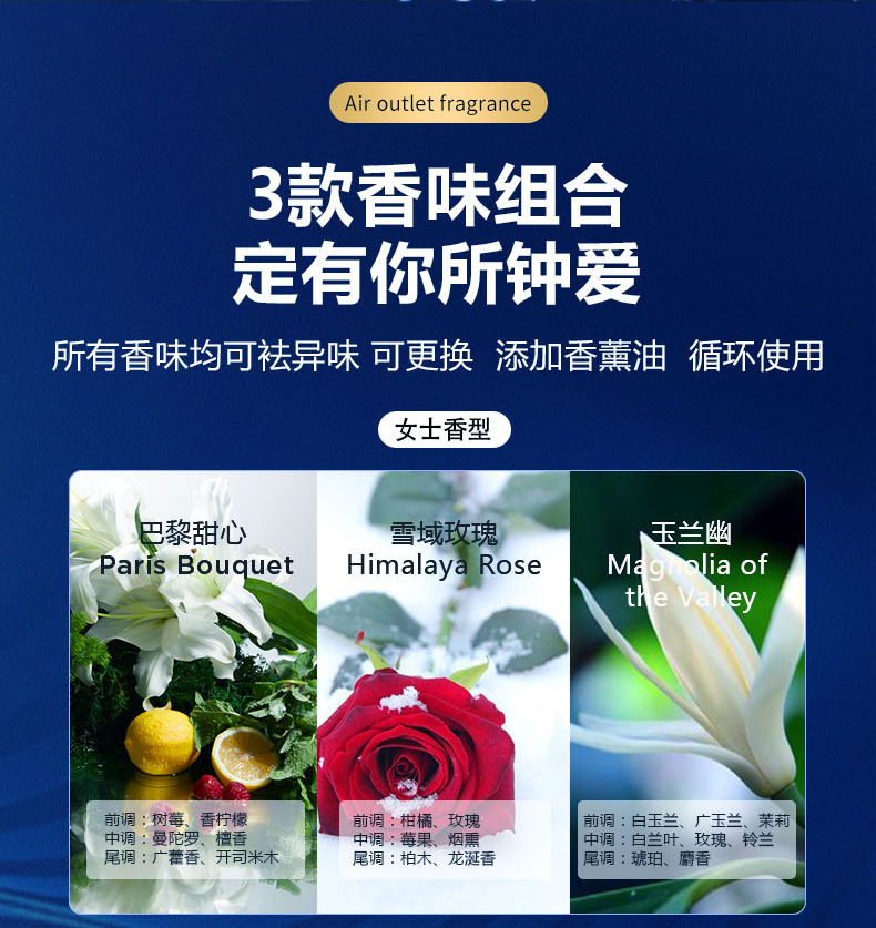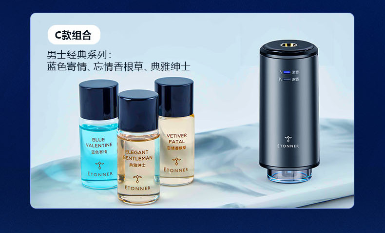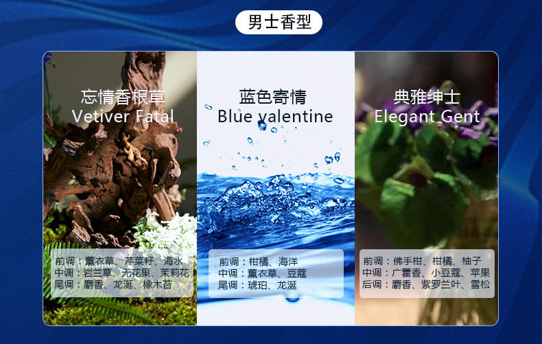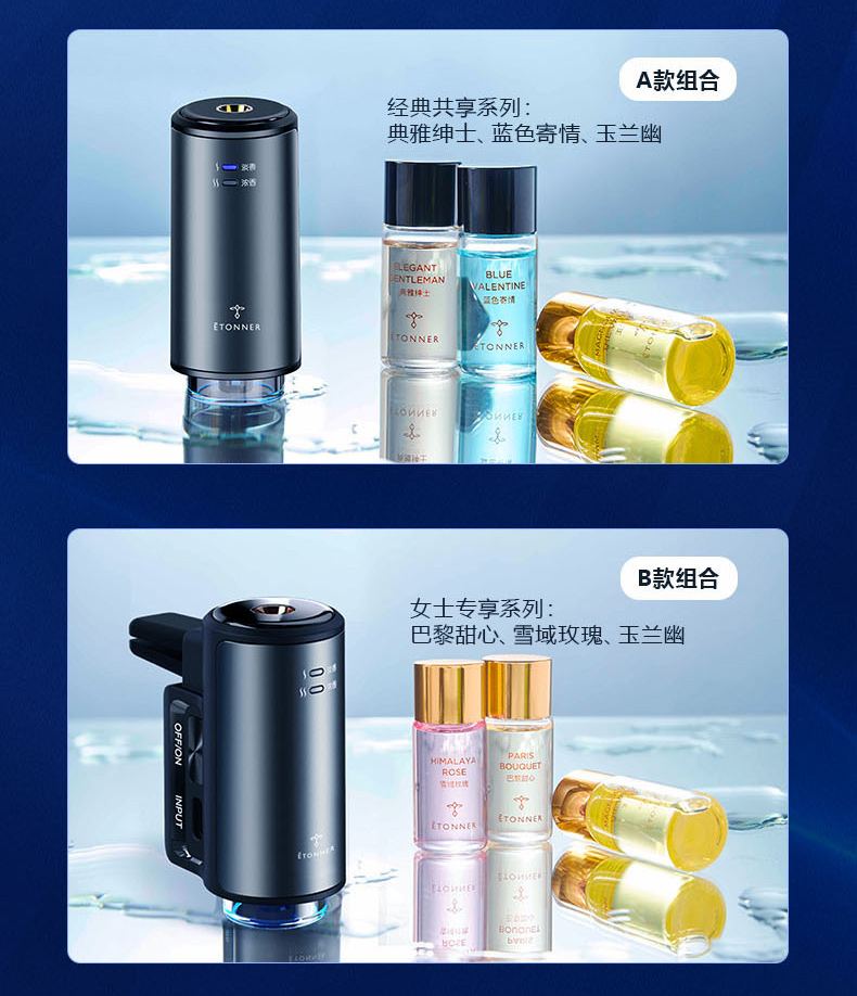 三款可选: A款经典共享:蓝色寄情+玉兰幽+典雅绅士; B款女士专享:巴黎甜心+玉兰幽+雪域玫瑰; C款男士经典:蓝色寄情+忘情香根草+典雅绅士 注:其中B款女士系列的是金色瓶盖 只能使用特定的香薰油,与其他的不通用(机器激光打标+3元)