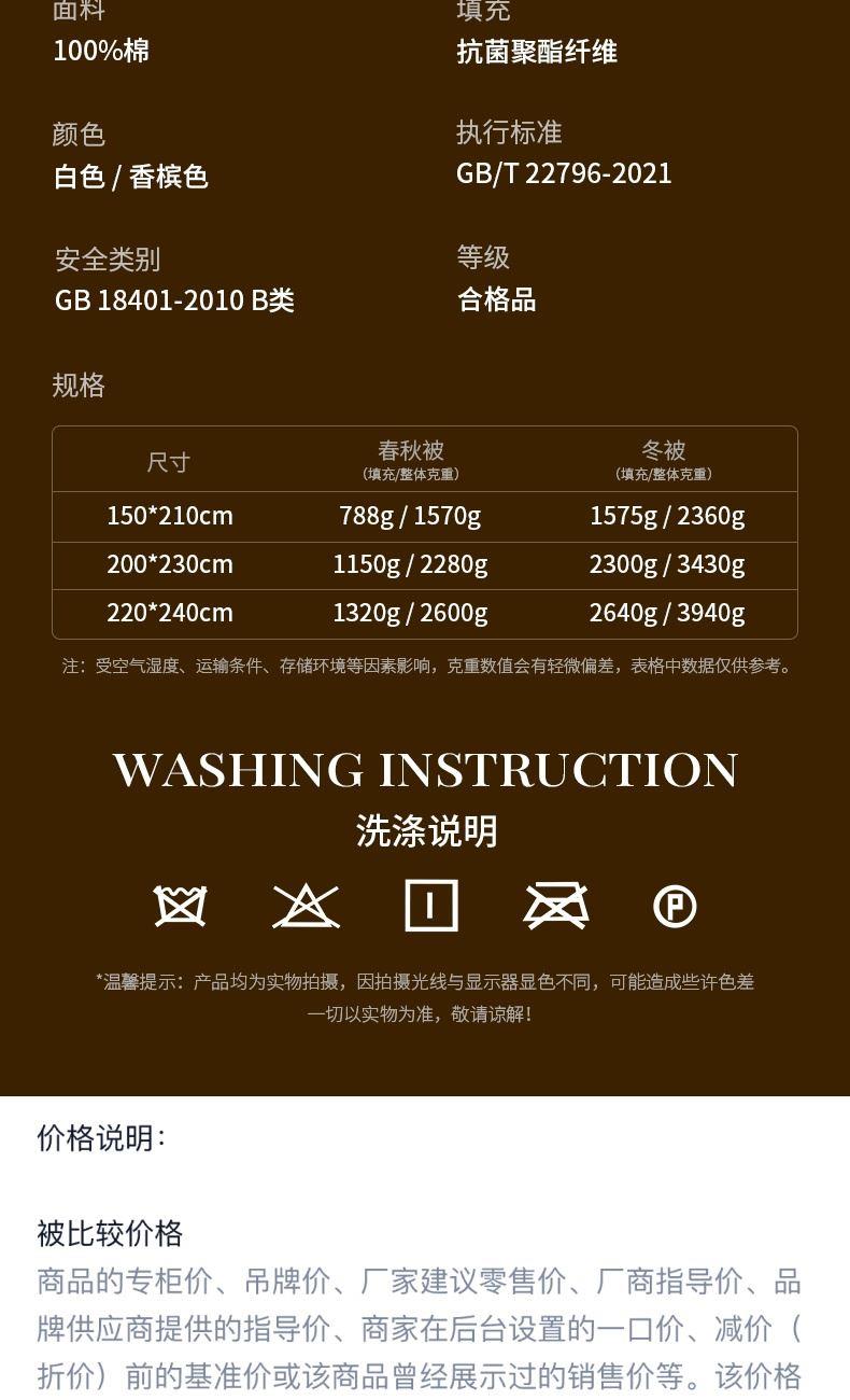 【产品面料】全棉(60支) 【产品填充】聚酯纤维 【产品颜色】白色 【产品规格】200*230cm/填充克重1150g/整体克重2280g 【产品包装】careseen无纺布袋 【包装尺寸】50*40*16cm 优质精梳棉,在高品质棉花田中手工采摘,只选取39mm长纤维绒朵面料才足够细腻坚韧 光能速热锁温芯,光能自发热,被窝暖得快纳米微粒锁住身体热量整晚动态控温,不闷不凉刚刚好