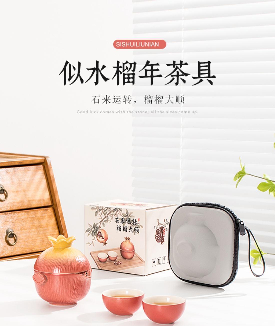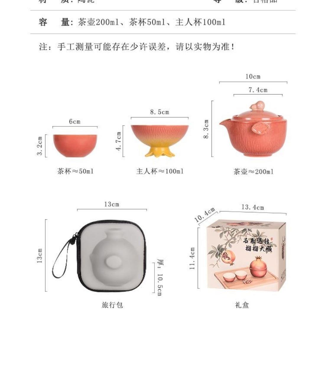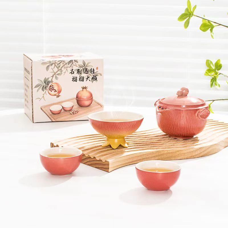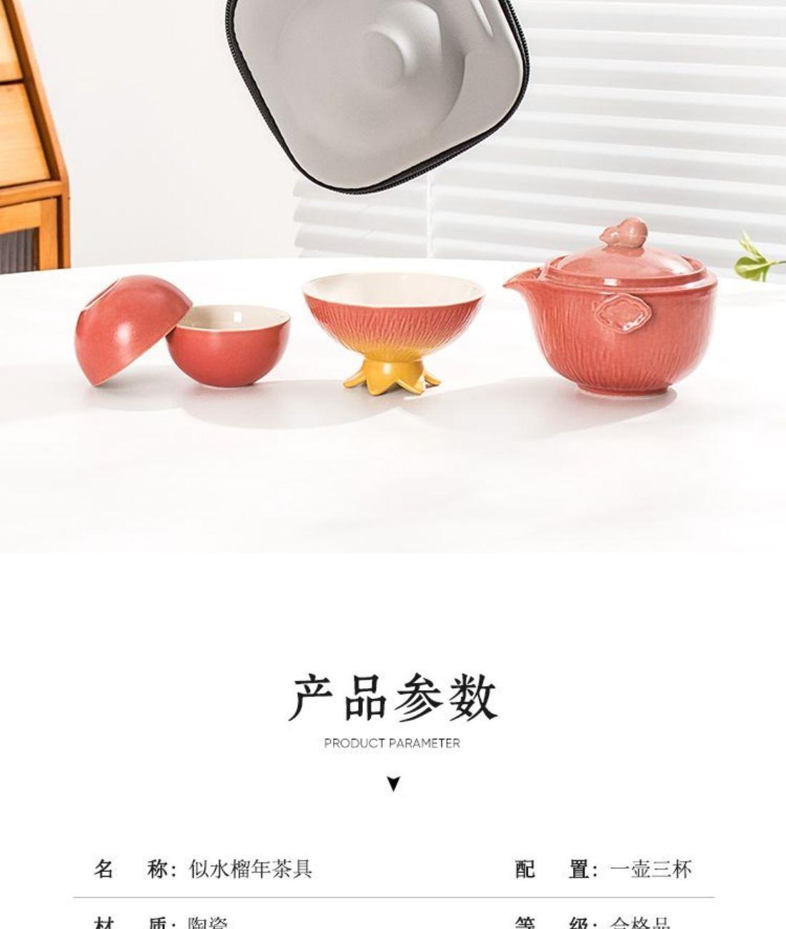 配置:茶壶x1、杯x3 彩盒:13.4x10.4x11.4cm 外箱尺寸:42*42*50CM 容量:壶200ml、杯50ml ,主人杯100ML 尺寸:茶壶10.5x10x8cm 杯口径6x高3cm 似水榴年茶具 石来运转,榴榴大顺 石榴入器 清新出彩石榴造型,红与黄晕染出果实成熟的鲜活,恰似岁月沉淀出的热烈与温柔。沸水注入,茶香袅袅升腾,如流年缓缓流淌,每一次举杯都是与美好时光的温柔相拥,让日子在茶香与石榴的意象里,漾起诗意的涟漪。 一提即走场景不受限 搭配收纳包,轻松携带方寸之间打造泡茶新方式
