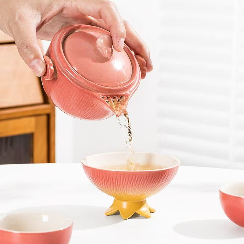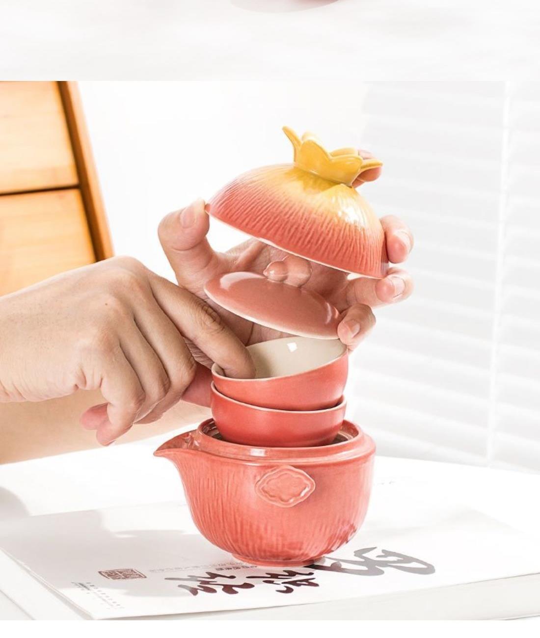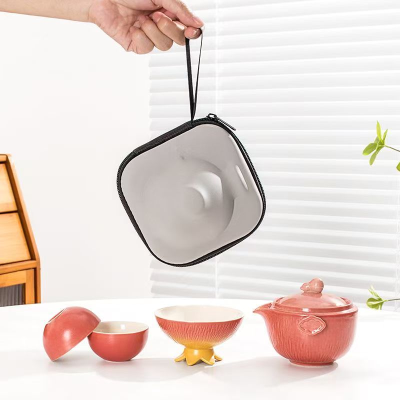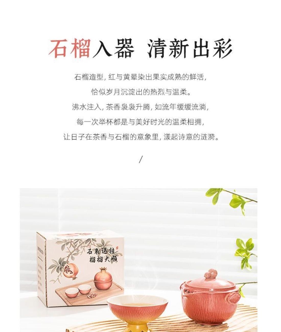 配置:茶壶x1、杯x3 彩盒:13.4x10.4x11.4cm 外箱尺寸:42*42*50CM 容量:壶200ml、杯50ml ,主人杯100ML 尺寸:茶壶10.5x10x8cm 杯口径6x高3cm 似水榴年茶具 石来运转,榴榴大顺 石榴入器 清新出彩石榴造型,红与黄晕染出果实成熟的鲜活,恰似岁月沉淀出的热烈与温柔。沸水注入,茶香袅袅升腾,如流年缓缓流淌,每一次举杯都是与美好时光的温柔相拥,让日子在茶香与石榴的意象里,漾起诗意的涟漪。 一提即走场景不受限 搭配收纳包,轻松携带方寸之间打造泡茶新方式