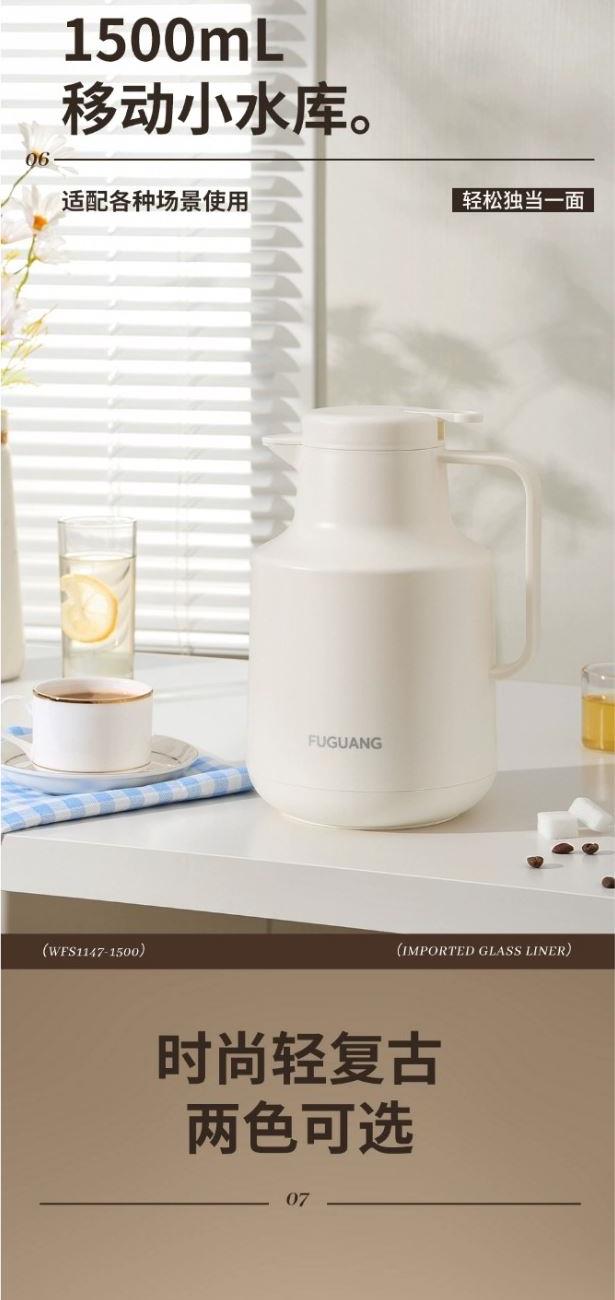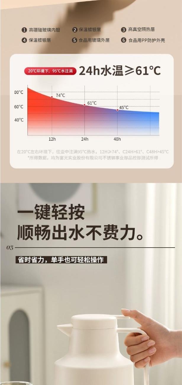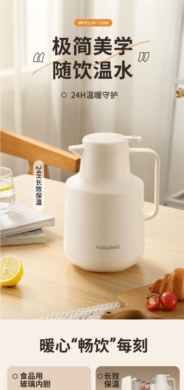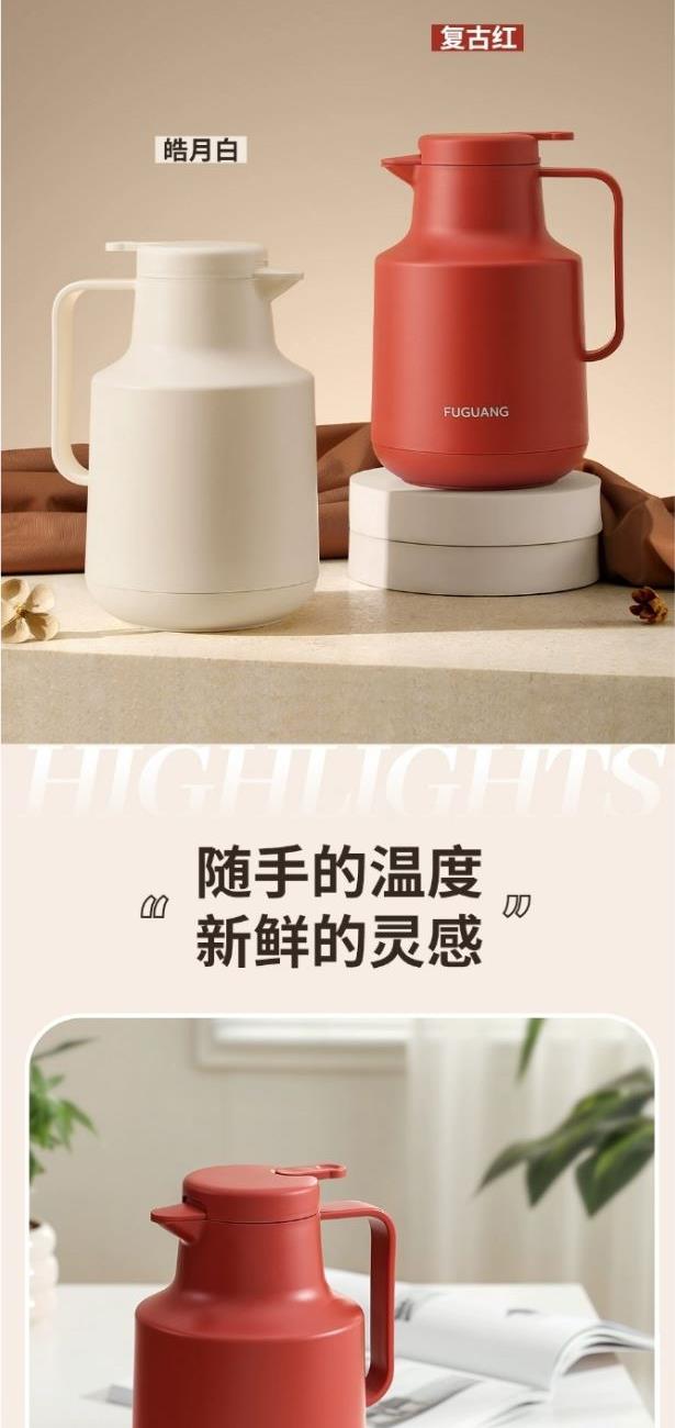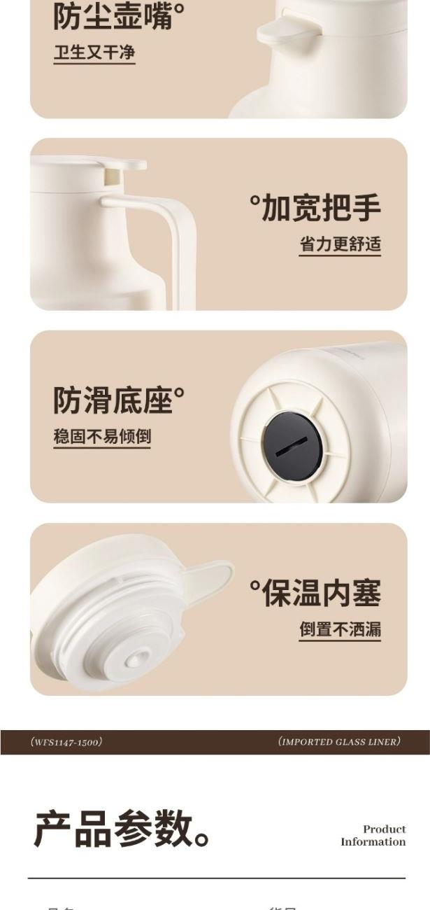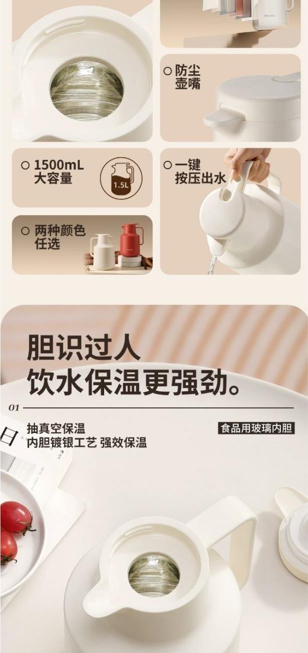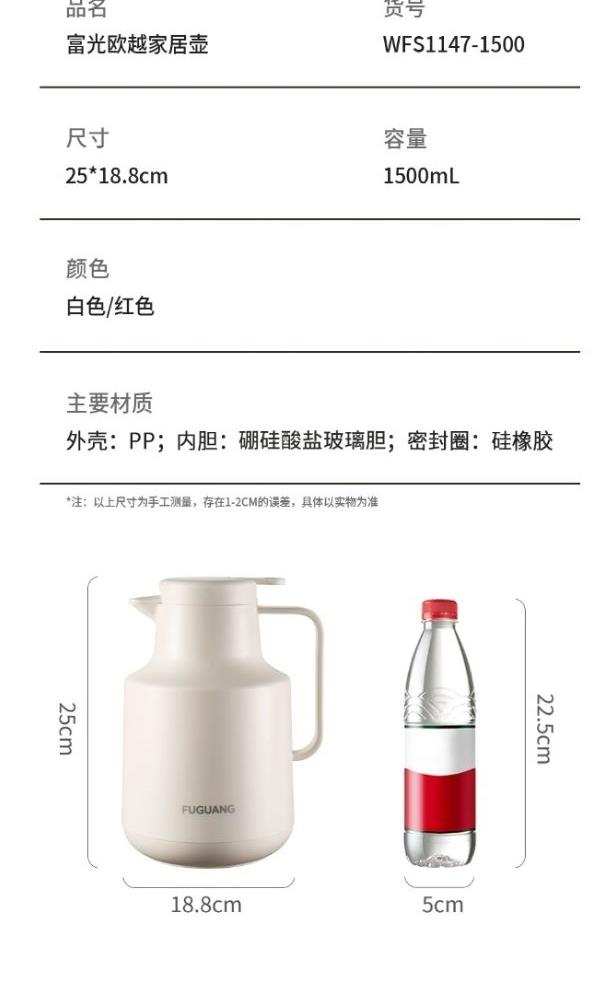 容量:1500ml 颜色:绿色 白色 红色 尺寸:15.5*25cm 材质:食品级PP壶身外壳,高硼硅红胆玻璃内胆,食品接触用硅胶圈。 真空夹层,增强保温效果。一体式把手,人体工学设计,宽厚省力,防滑底垫放置更稳不易倾斜。 包装:单瓦盒