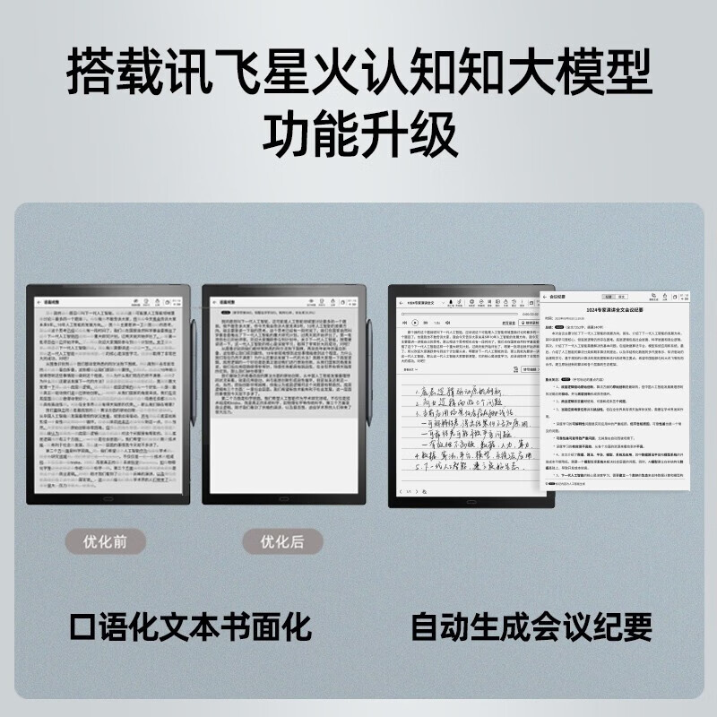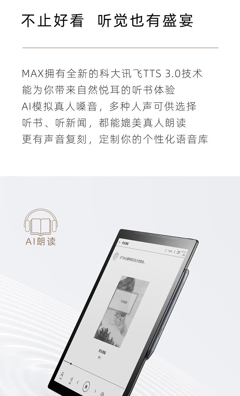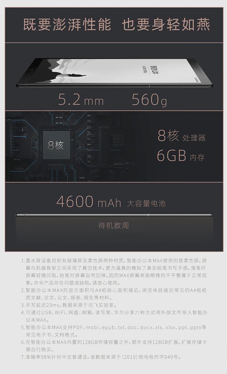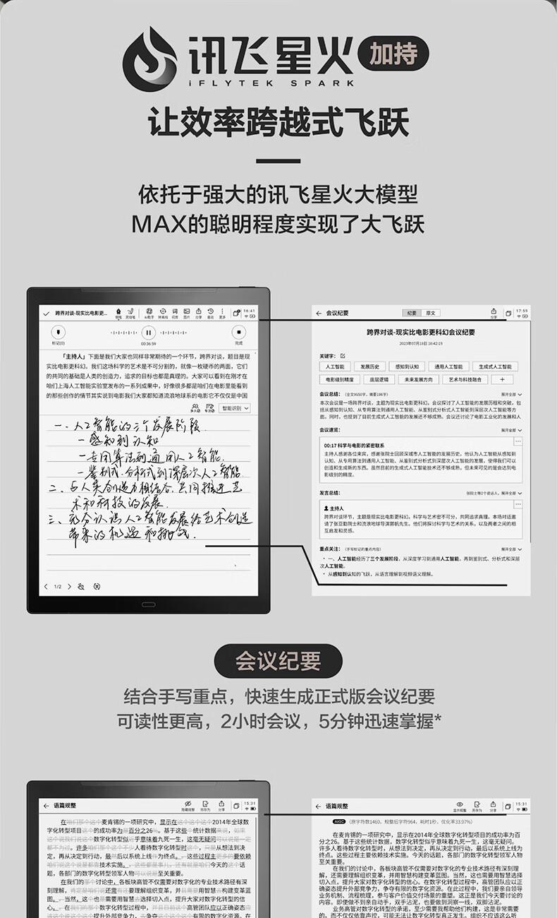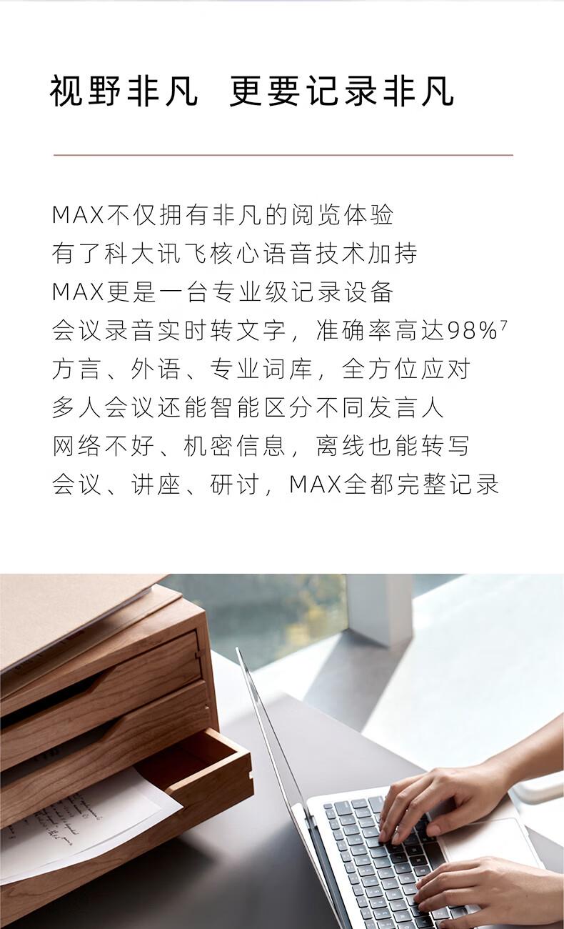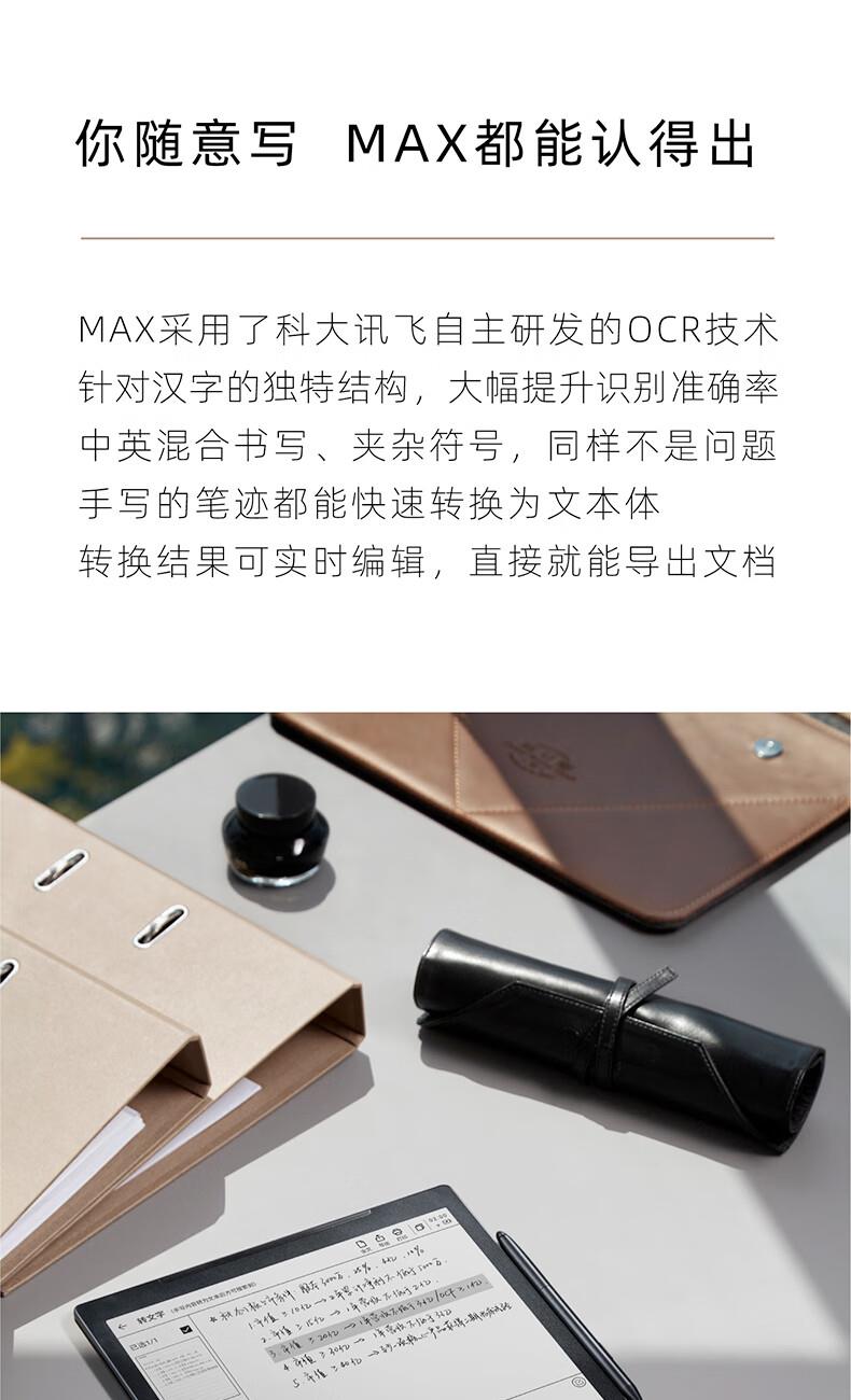 科大讯飞(iFLYTEK) 商品编号:10063391661069 内存容量:128GB 类别:阅读器套装 分辨率:207ppi 机身色系:黑色系 屏幕尺寸:13.3英寸 手写功能:电磁 功能:语音转文字 CCC强制性认证:是 型号:MAX 国补备案型号:XF-DX-T113E 认证型号:XF-DX-T113E