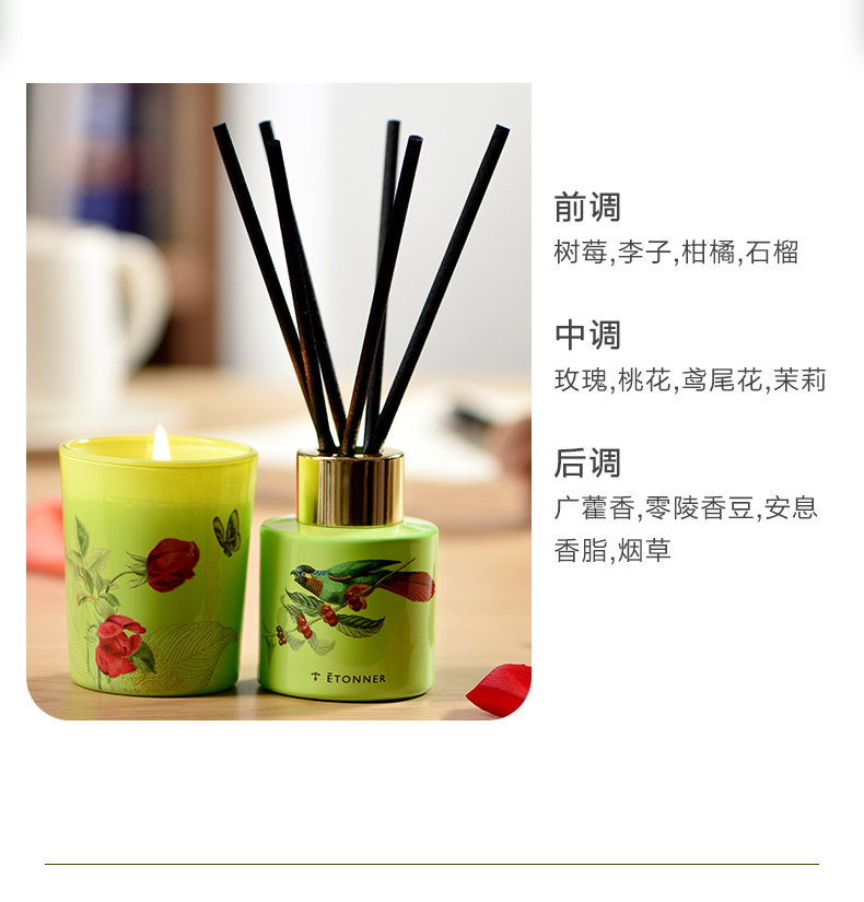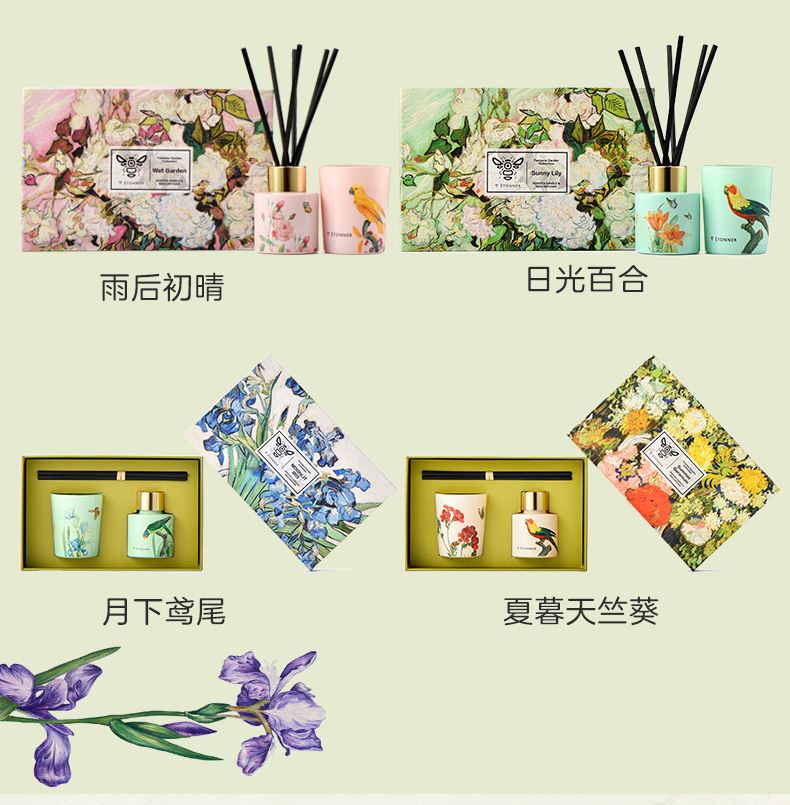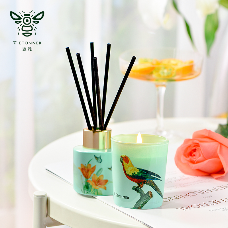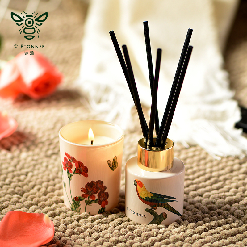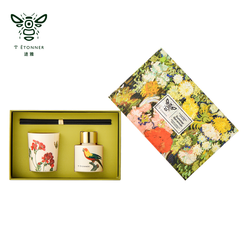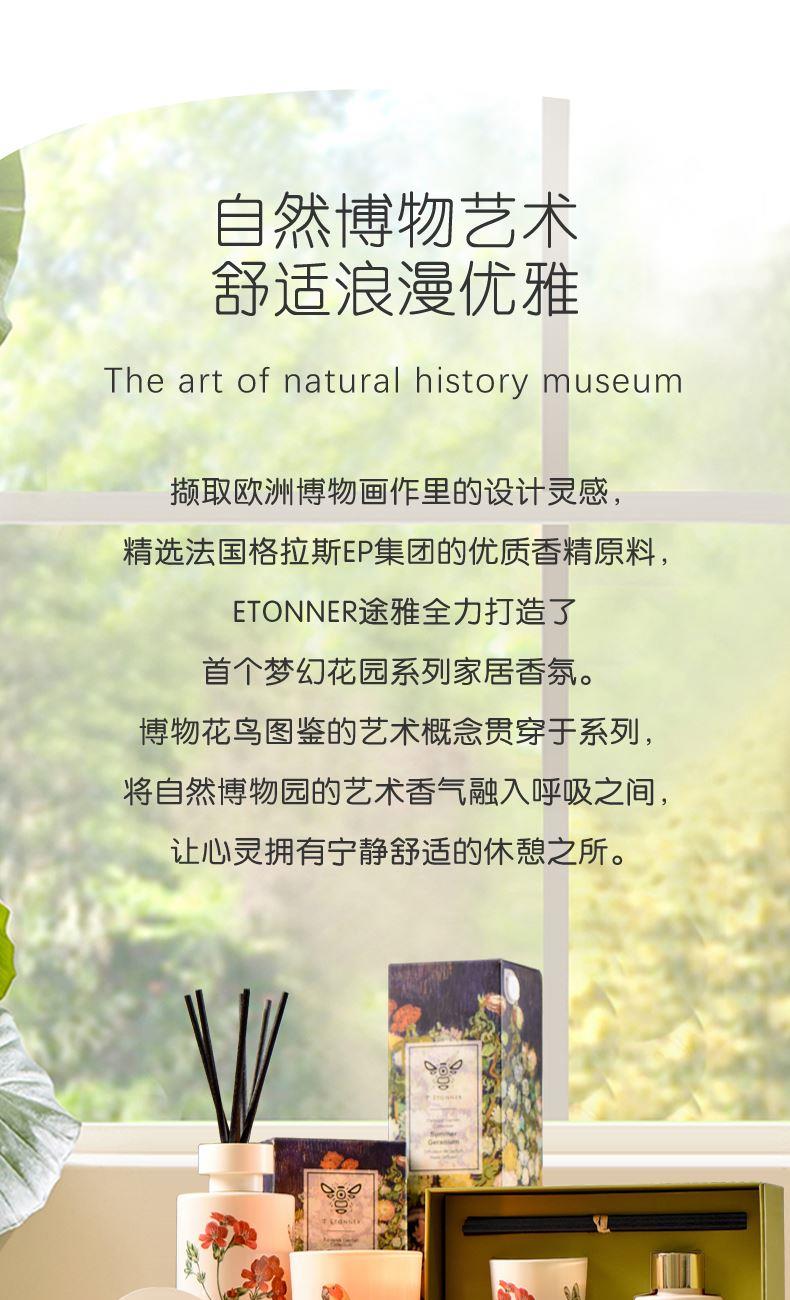 撷取欧洲博物画作的设计灵感, 精选法国格拉斯EP集团优质香精, ÉTONNER途雅全力打造了梦幻花园系列家居香氛。 欣赏博物花鸟图鉴艺术, 呼吸自然博物园的灵动香气, 让心灵拥有宁静舒适的休憩之所。 途雅每一款香氛都有其独特的香味灵魂, 由内而外散发着优雅的气质。 香薰:50ml,蜡烛70g,4*160mm藤条6根 香型: 雨后初晴 Wet Garden 日光百合 Sunny Lily 夏暮天竺葵 Summer Geranium 春日玫瑰 Spring Rose 月下鸢尾 Moonlit Iris 另外:途雅香薰蜡烛系列现货均采用法国进口香料,瓶身立体花纹制作,配精致礼盒礼袋包装,礼品档次不一样。 如需低价位产品,可洽根据具体要求定制。