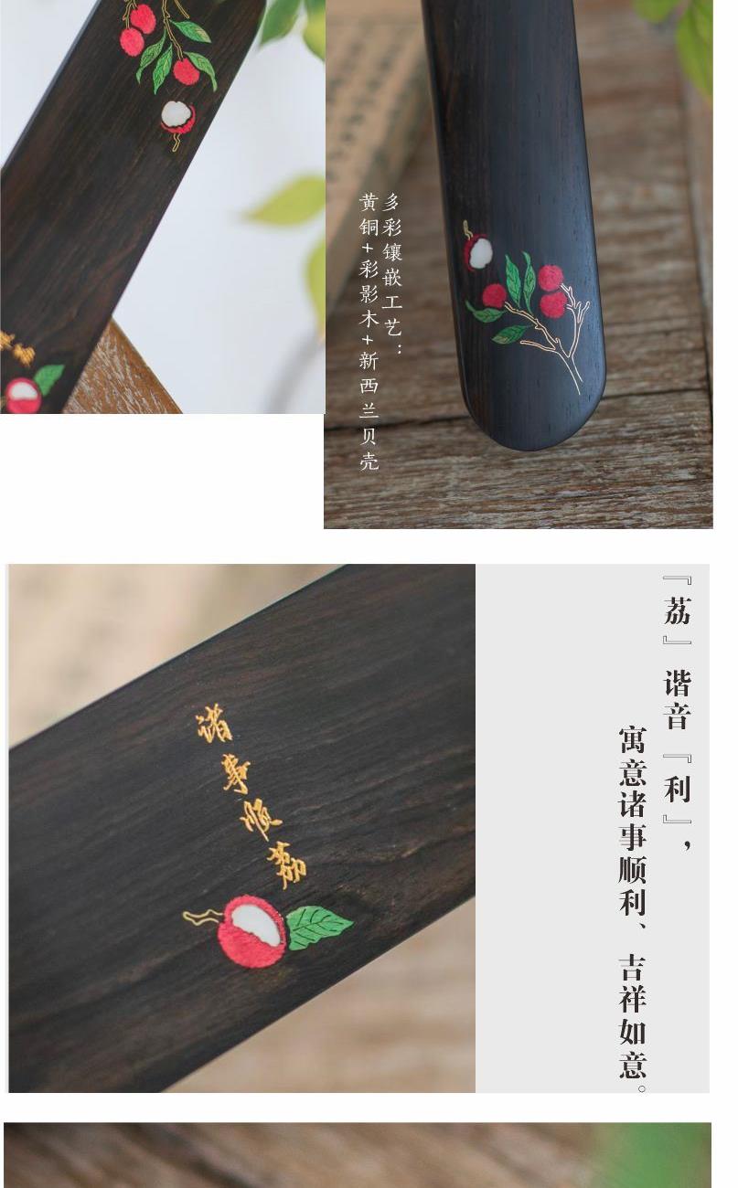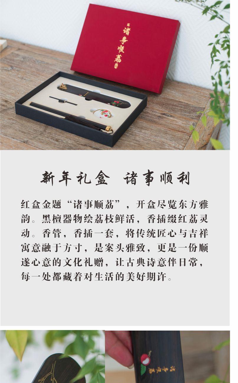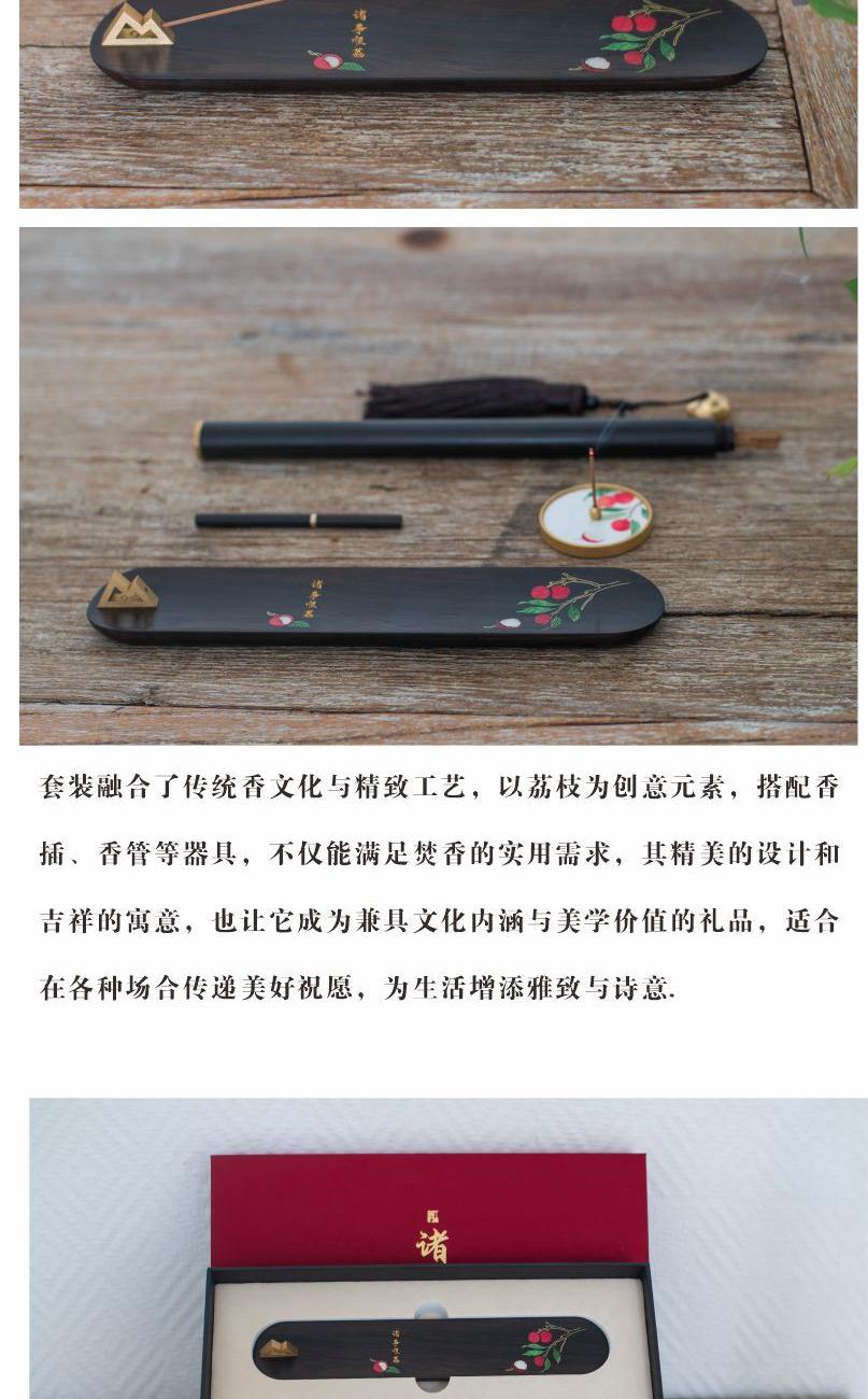 诸事顺荔·香具四件套 红盒金题“诸事顺荔”,开盒尽览东方雅韵。黑檀器物绘荔枝鲜活,香插缀红荔灵动。香管,香插一套,将传统匠心与吉祥寓意融于方寸,是案头雅致,更是一份顺遂心意的文化礼赠,让古典诗意伴日常,每一处都藏着对生活的美好期许。 材质|紫光檀+铜 组合|香托+香插+香管+香针 工艺|精雕+镶嵌 规格|长香插:22*4.2*4cm 圆香插:φ4.5*0.6cm 香管:23.5cm*φ1.8cm 香针:φ0.6* 10cm 包装盒:21*28*3.5cm 手提袋:34*24*6cm 配香:星洲水沉