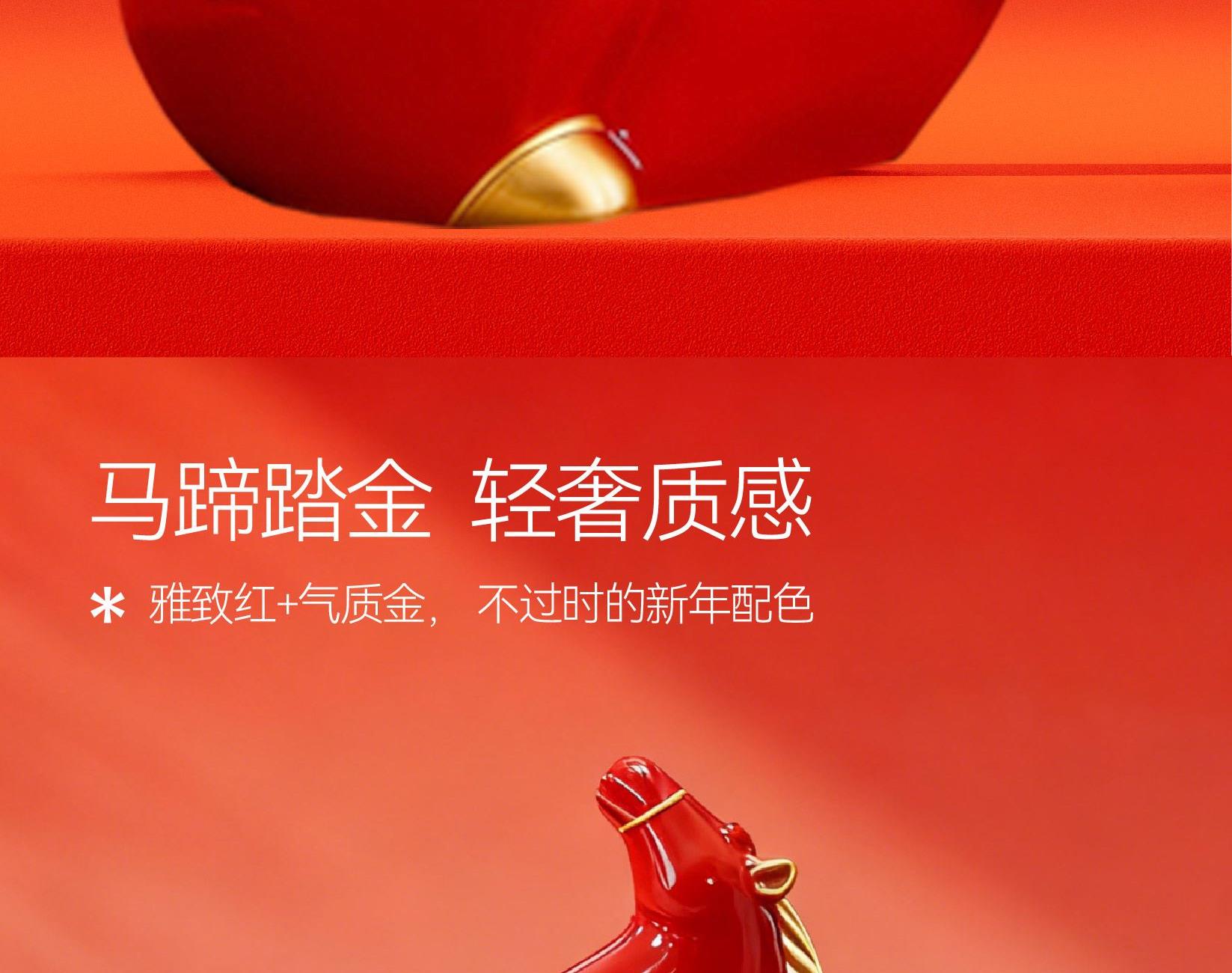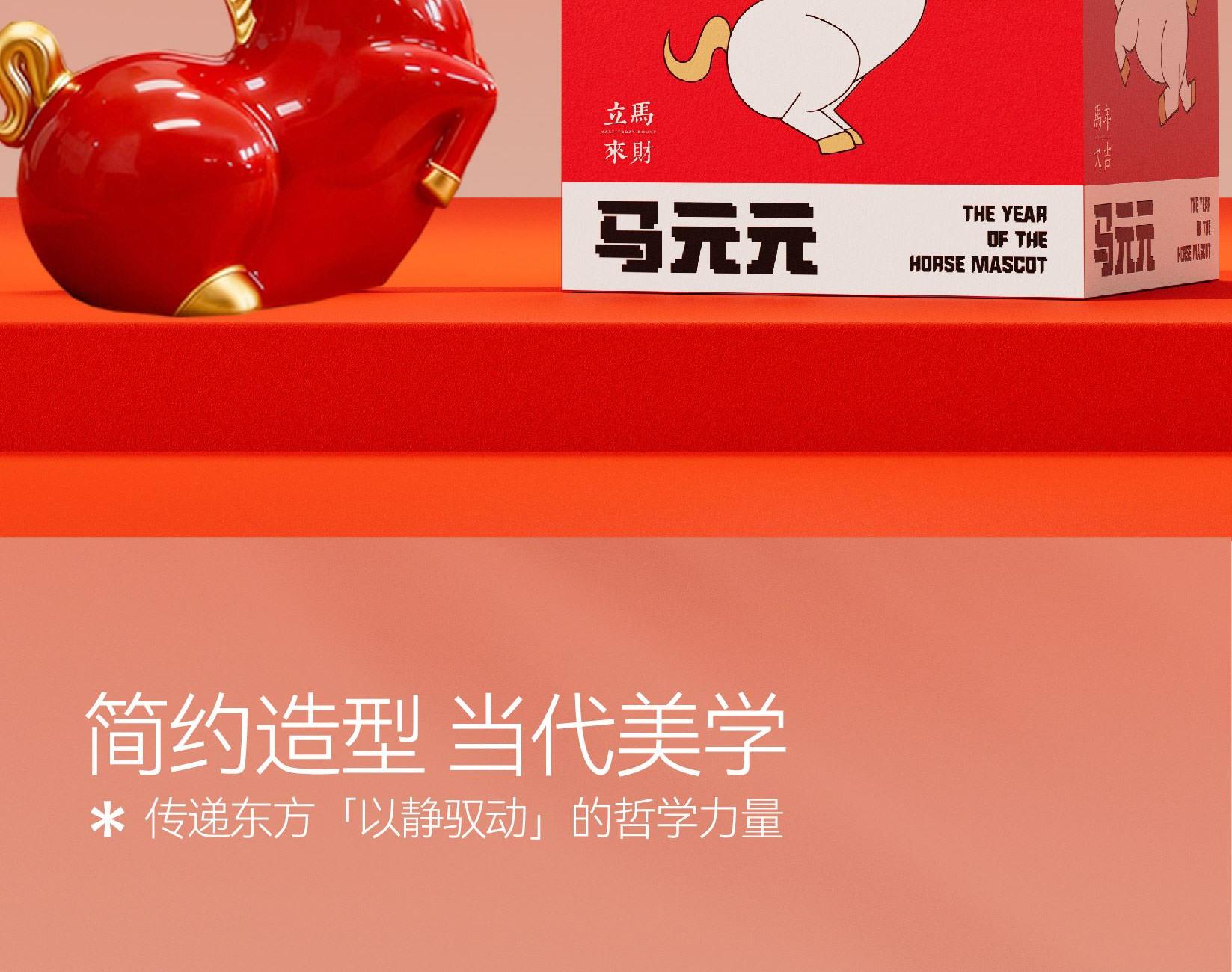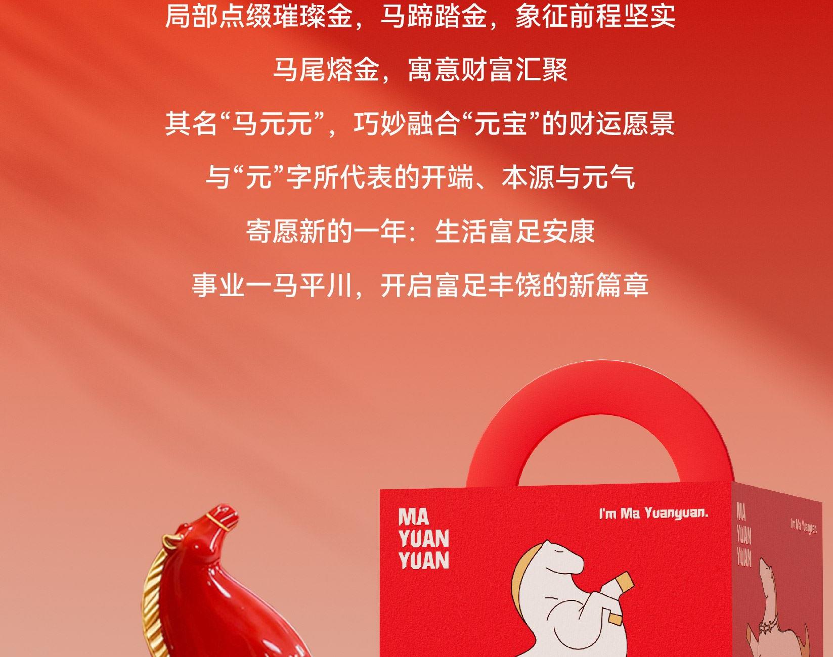 马身披覆中国红,彰显新年喜庆与热忱活力,局部点缀璀璨金,马蹄踏金,象征前程坚实;马尾熔金,寓意财富汇聚。 其名“马元元”,巧妙融合“元宝”的财运愿景与“元”字所代表的开端、本源与元气,寄愿新的一年:生活富足安康,事业一马平川,开启富足丰饶的新篇章。 规格: 高约12cm;宽约11cm 材质:陶瓷 包装尺寸:13.5✘13.5✘13.5cm