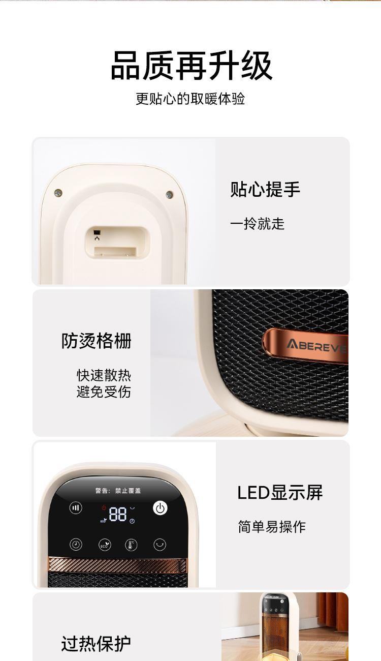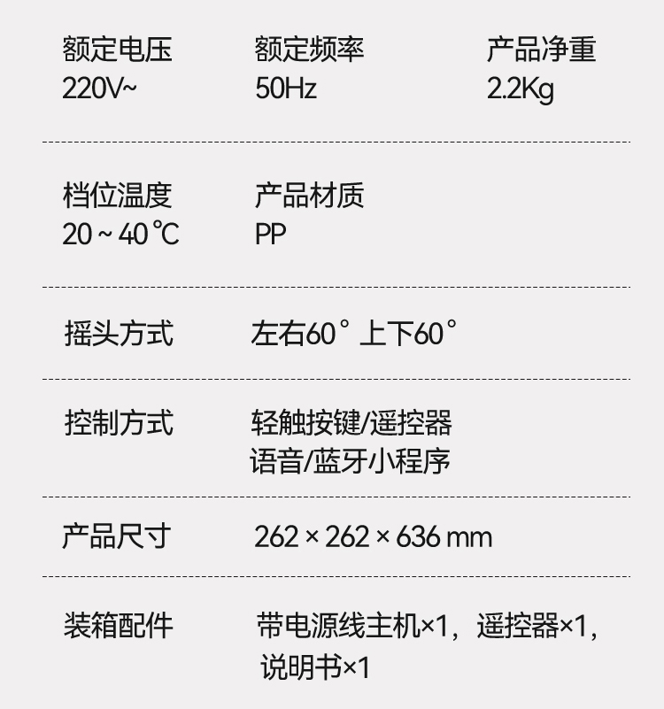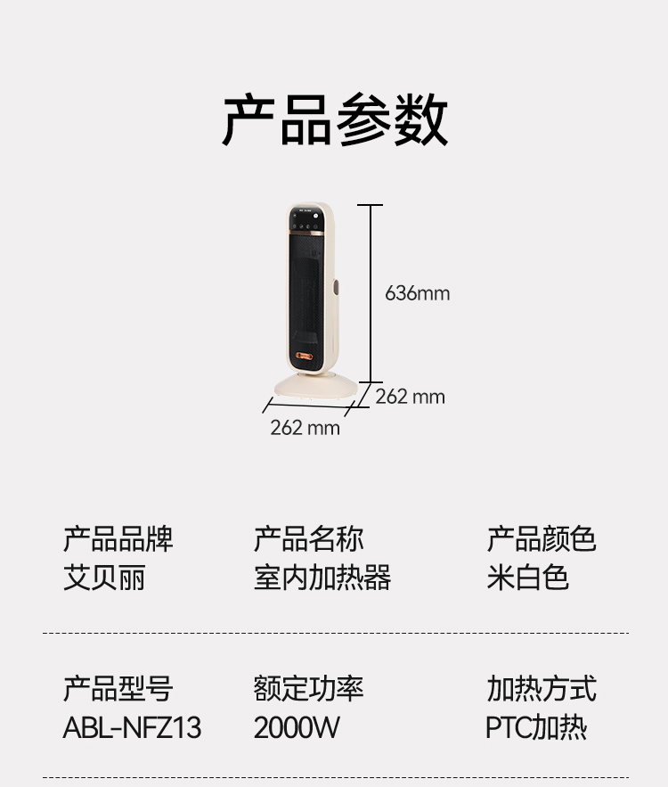 产品颜色:米白色 加热方式:石墨烯PTC陶瓷发热 额定电压:220V~ 额定频率:50Hz 摇头角度:俯仰上下60° 档位/功率:三档调节产品 净重:2.2kg 产品毛重:2.8kg 产品尺寸:262*263*636mm 包装尺寸:655*220*197mm ◁ 石墨烯速热科技,冬日取暖不等待 ◁ 远距遥控操作、语音控制、触控控制 ◁ 12H智能定时,轻音安心舒睡 ◁ 20-40°C广域调节,不同室温下都能找到理想温度 ◁ 60°大广角摇头,满足大空间多人取暖需求 ◁ 倾倒断电保护,家有宠物、孩童也能放心使用