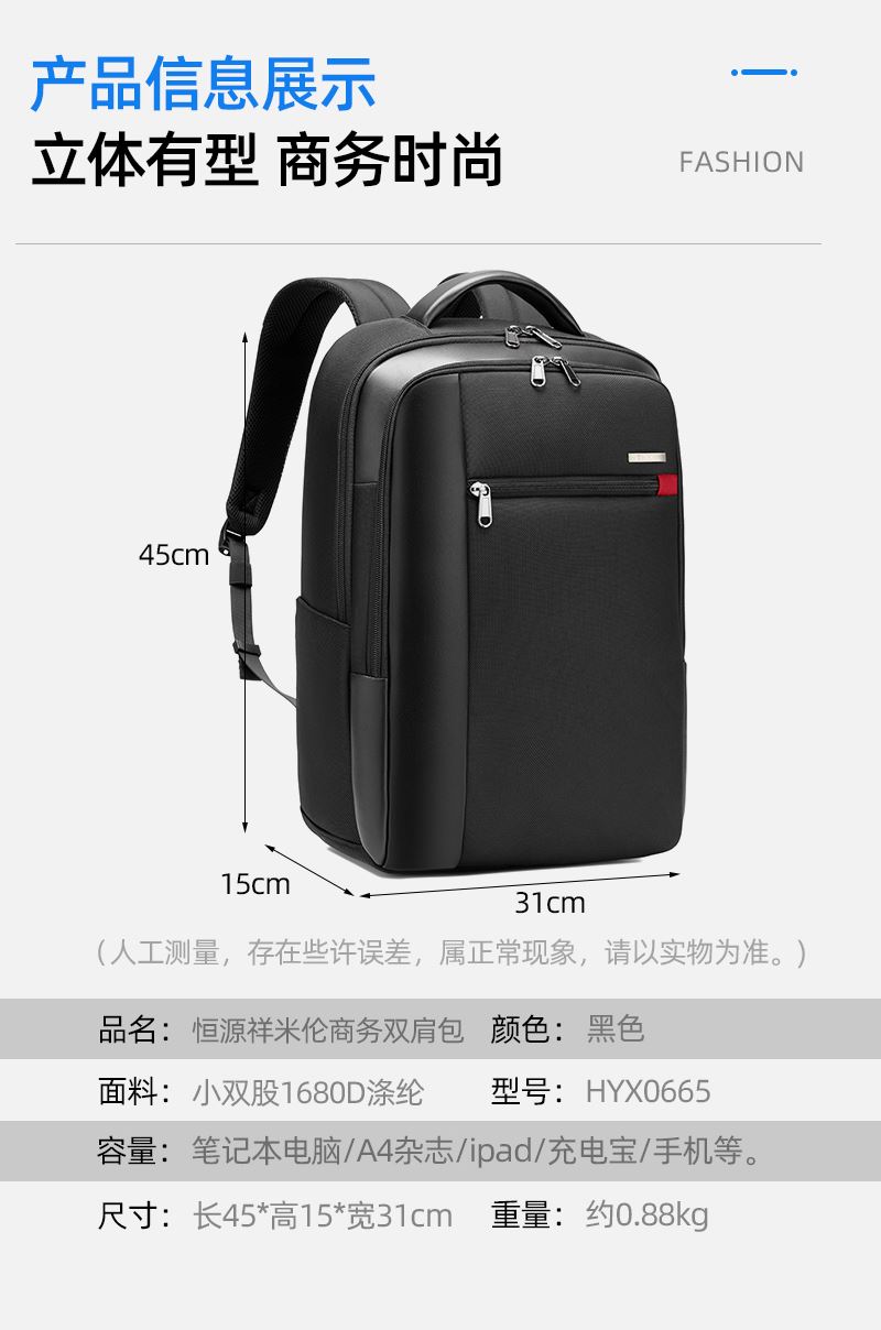 产品型号:HYX0665 产品颜色:黑色 产品材质:小双股1680D涤纶 产品尺寸:45*31*15cm 产品重量:0.88kg 外包装尺寸:45*48*65mm
