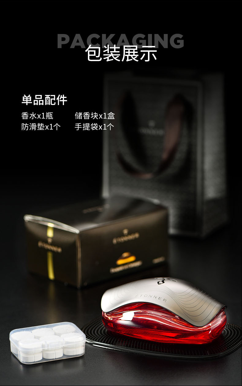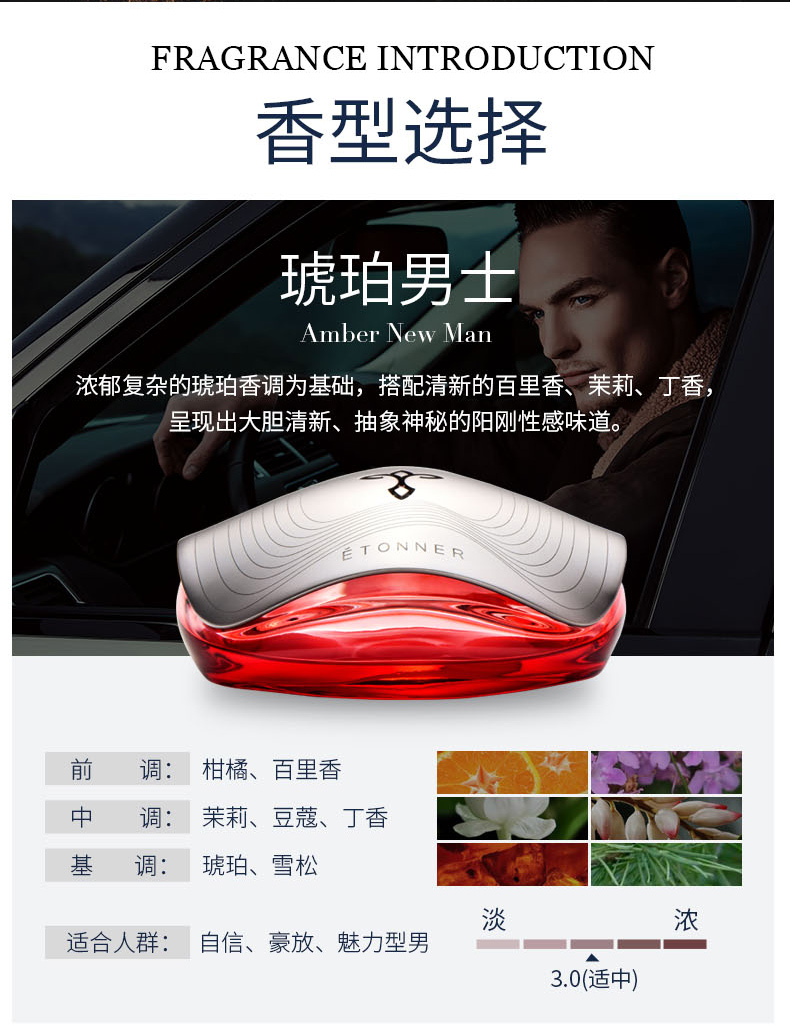 湛蓝的海水轻轻的荡漾着,起了一层又一层的涟漪,靠近日落的海面,晶莹剔透,清澈中泛着灿灿的金光,令人心神随之荡漾。远处的船只正在缓缓的回港,守候这场日月交替的盛典……、 设计:法国设计师曾获红点设计大奖设计师设计 香料:法国格拉斯PE集团直供优质香料 工艺:珠宝级锻造工艺 标配: 瓶内40ML香水+储香块12粒+防滑垫、喷式试用装1支(5ML)、礼品盒手袋 5种香型 琥珀男士A、 古龙C、 海洋O、 真我D、 自由之翼F