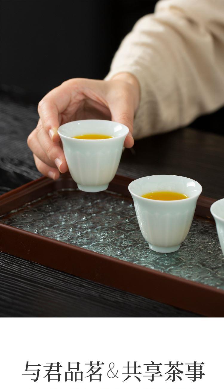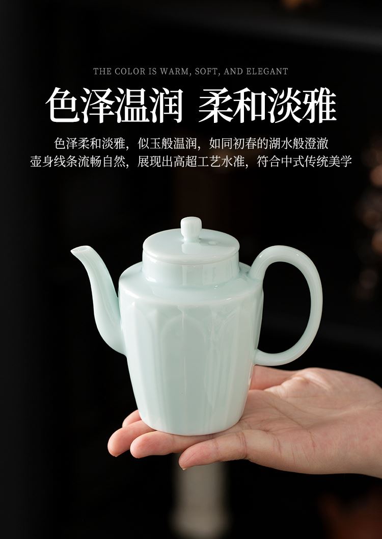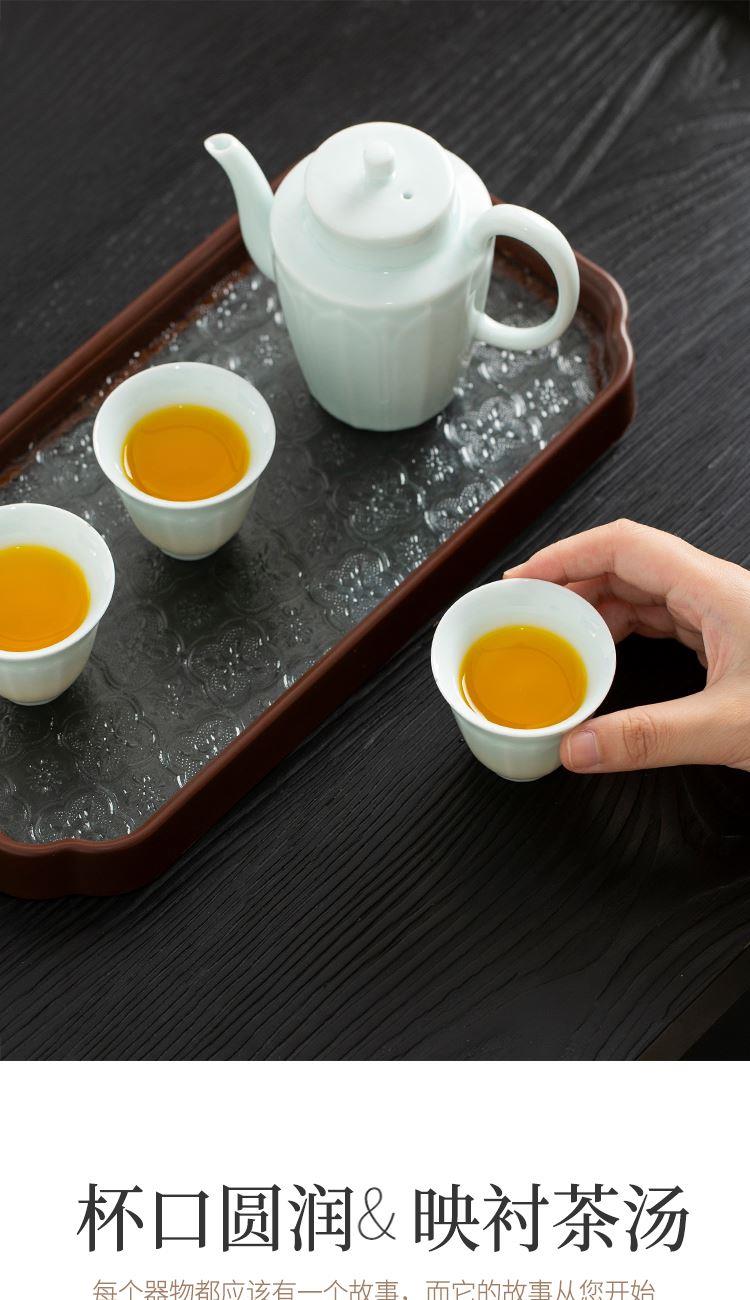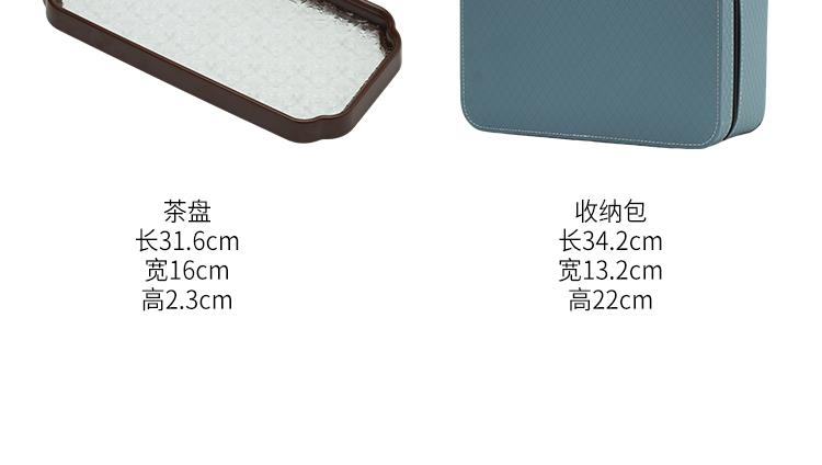 配置:高壶*1 品茗杯*6 茶海*1 玻璃茶盘*1 皮包*1 材质:影青瓷 礼盒尺寸:34.2cm*13.2cm*19.5cm 产品尺寸:品茗杯 60ml 盖碗 200ml 壶 250ml 茶海 230ml