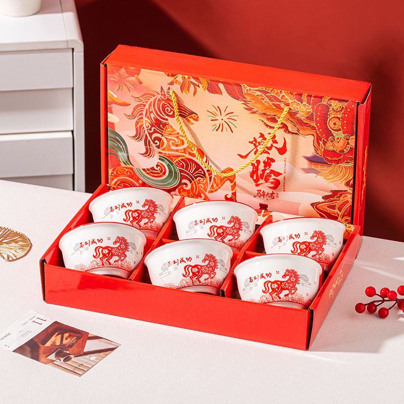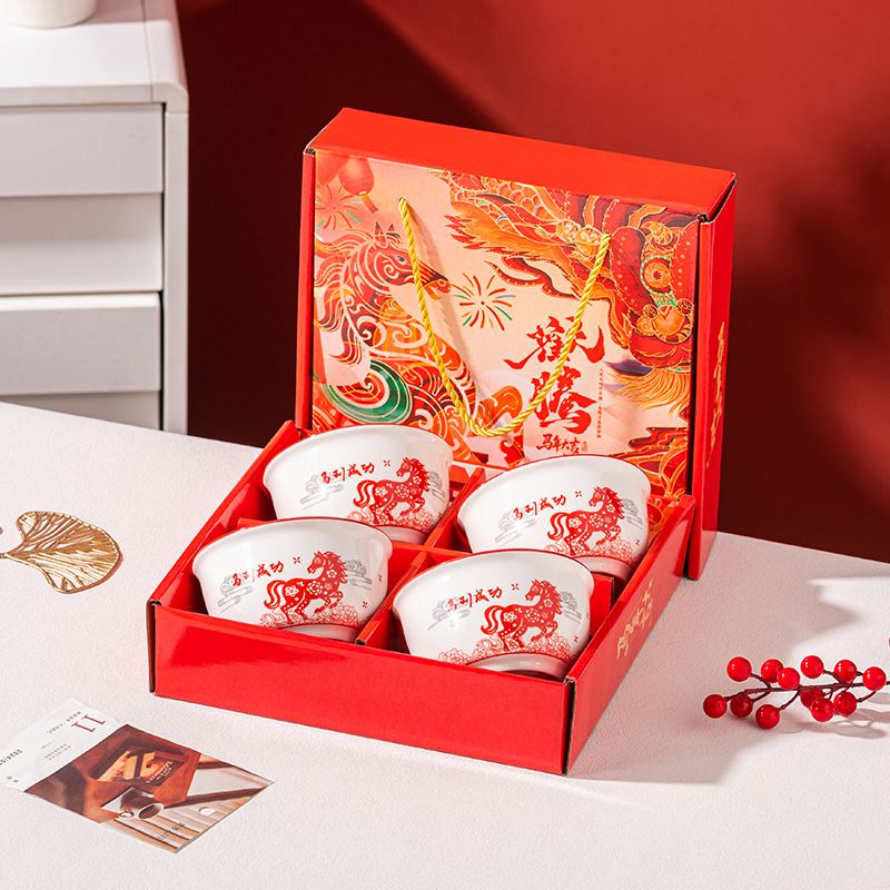 4碗套装:规格:25*6*24.5cm、880g, 外箱尺寸:51×32×51CM 24kg、配法:4碗 产品特点: 马年窗花碗礼,把新春福气捧在手心,当马年的祥瑞遇上传统剪窗花工艺,这组碗具礼盒便成了新春里别致的心意。那碗身的骏马剪纸,红得热烈又鲜活,似是从民俗窗花里跃出,带着“马到成功”的美好祈愿,将年节的红火与祝福都盛了进来。无论是自家添新岁,还是赠予亲友贺新春,这一份融了传统剪纸艺术与马年吉兆的礼,都能让年味在餐桌间,在心意里,悄然升温。