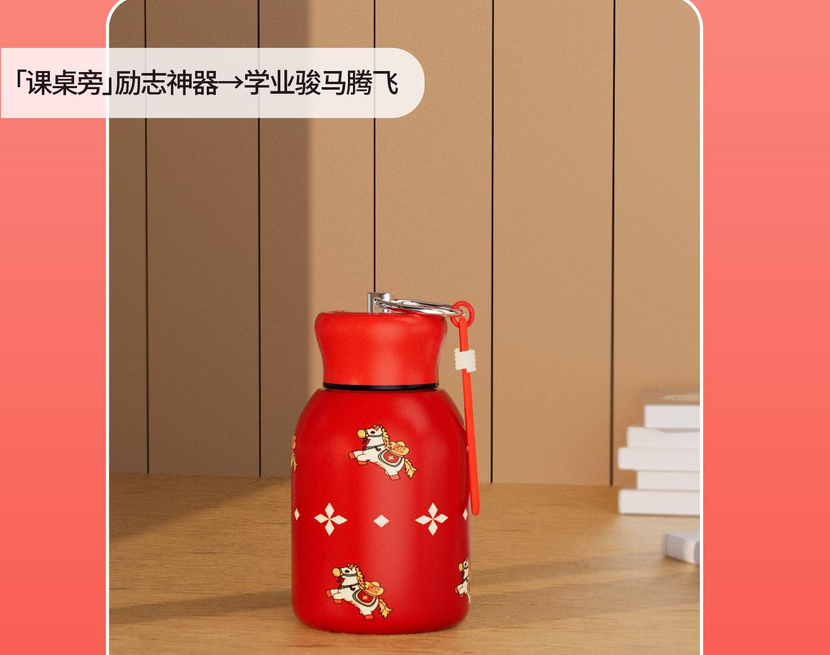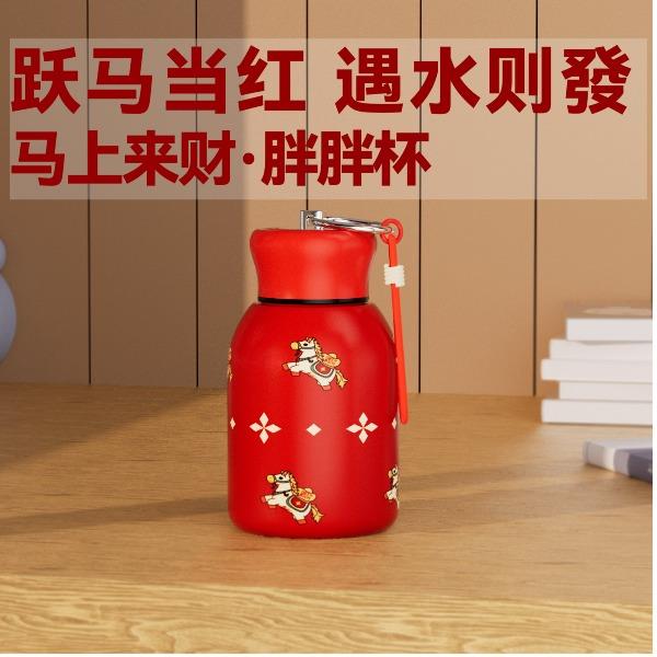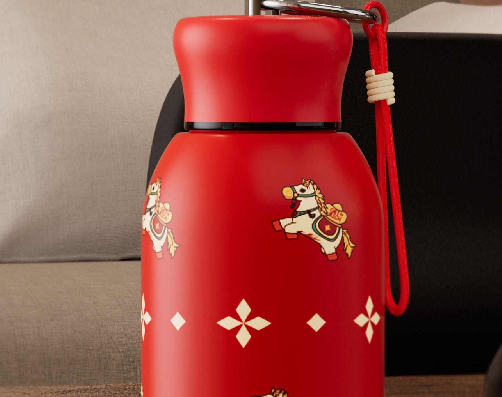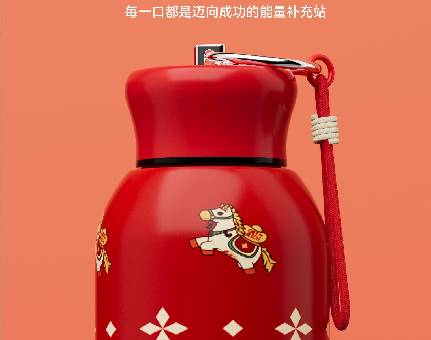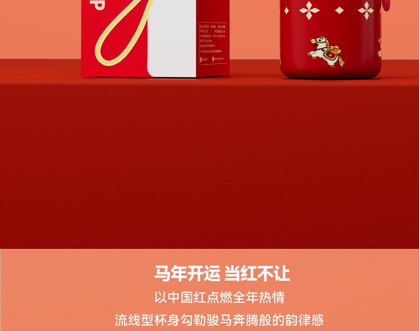 用简练笔触勾勒骏马驮载元宝的灵动姿态。马身姿态昂扬,步履轻盈,寓意新年疾驰而至的福运与财气。马蹄轻启,财随喜至;不驮重负,只载光明。 内配:杯子*1、时尚提绳*1 容量:300ml 材质:304不锈钢 杯子尺寸:7.6x11.8x14.1cm 包装尺寸:7.9x7.9x14.6cm