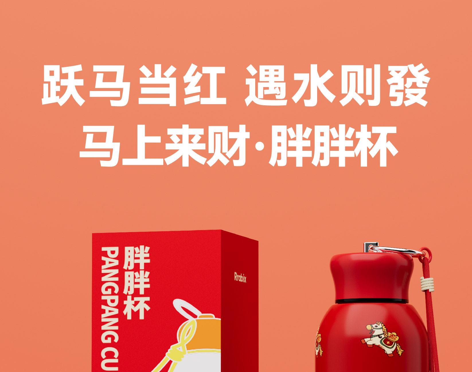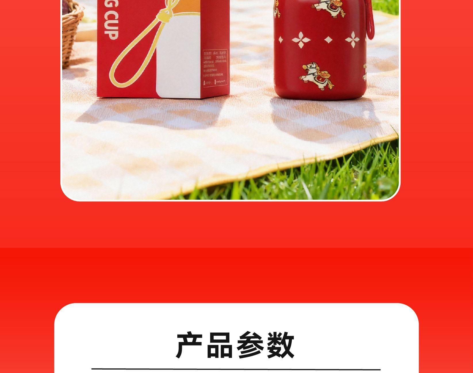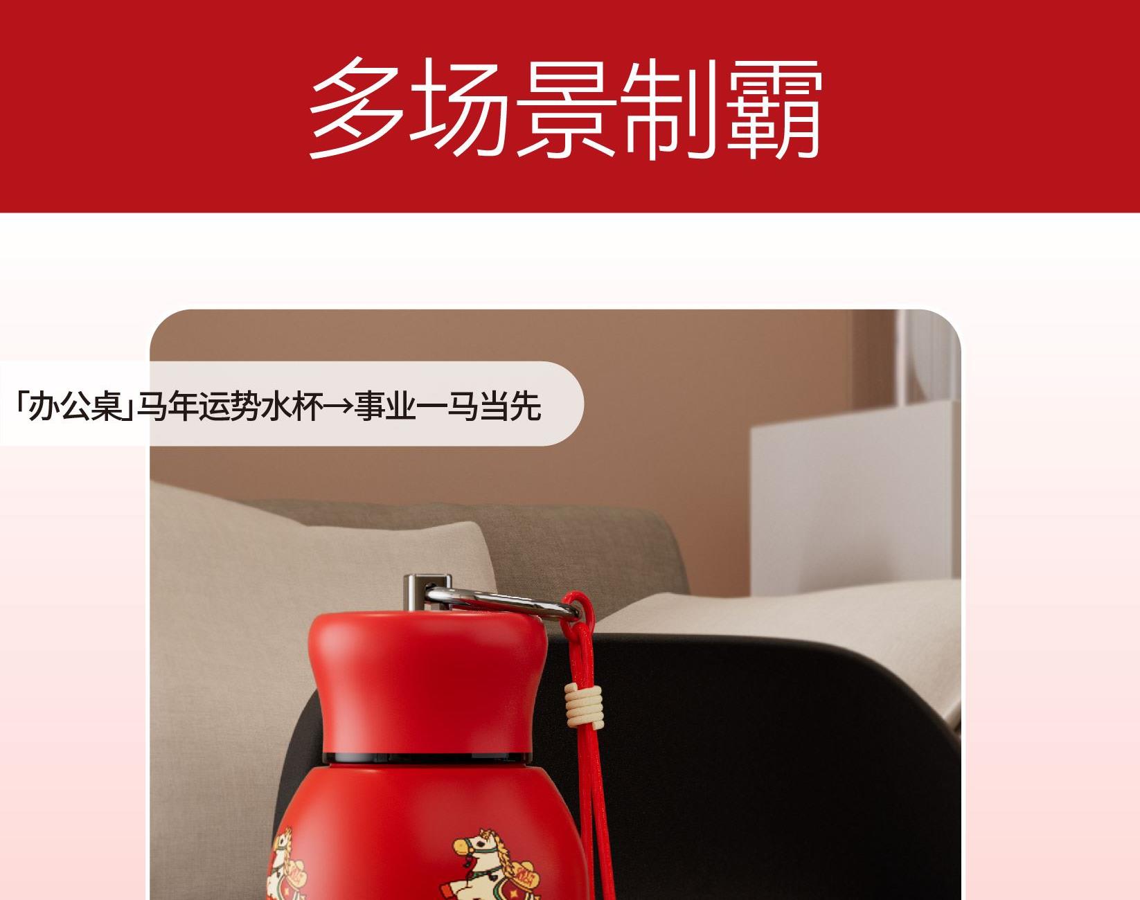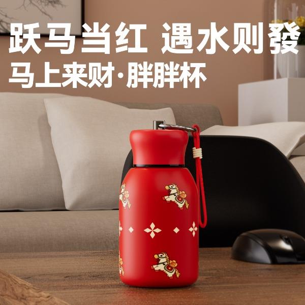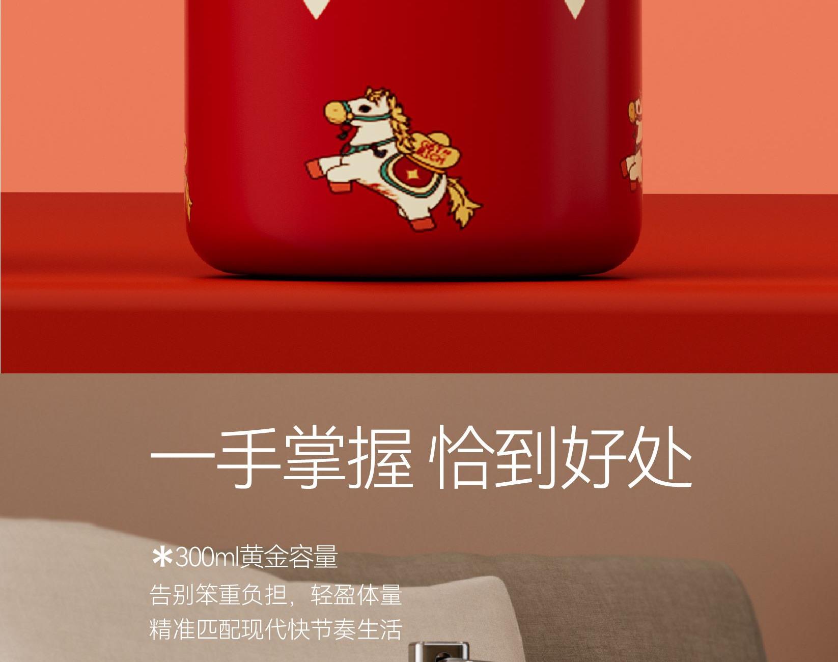 用简练笔触勾勒骏马驮载元宝的灵动姿态。马身姿态昂扬,步履轻盈,寓意新年疾驰而至的福运与财气。马蹄轻启,财随喜至;不驮重负,只载光明。 内配:杯子*1、时尚提绳*1 容量:300ml 材质:304不锈钢 杯子尺寸:7.6x11.8x14.1cm 包装尺寸:7.9x7.9x14.6cm