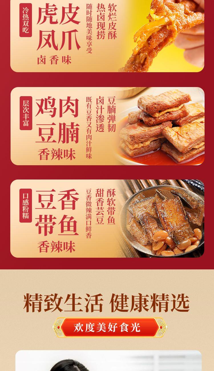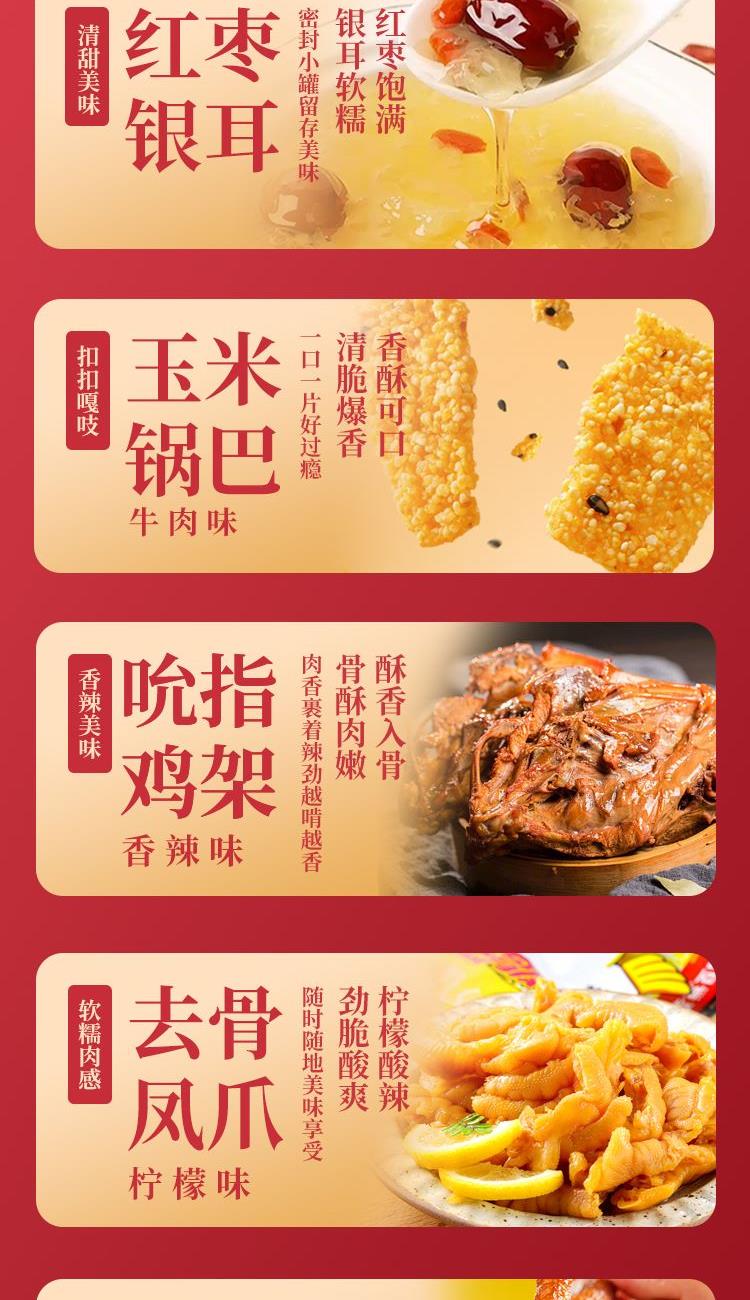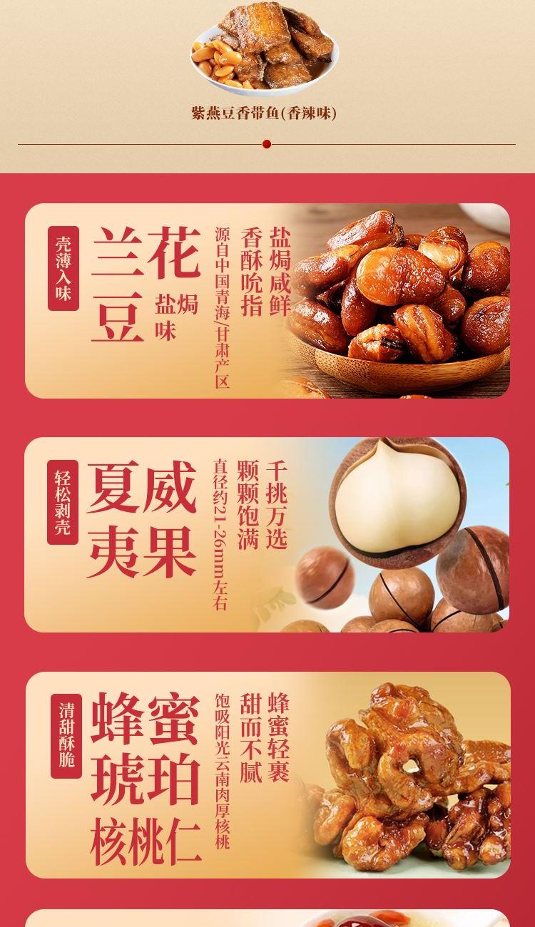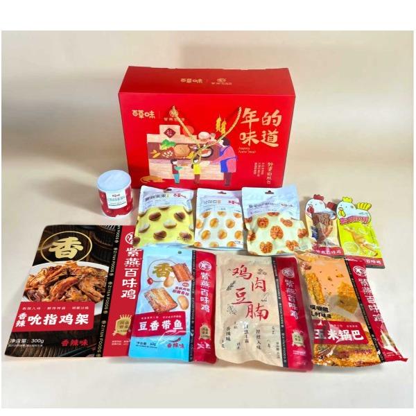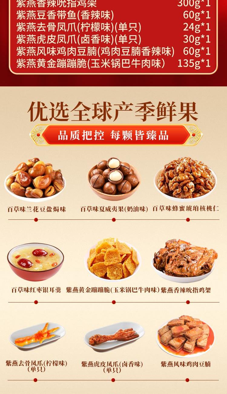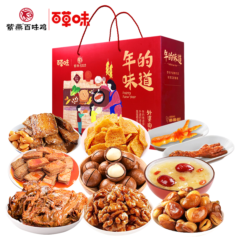【百草味】夏威夷果(奶油味)100g*1 【百草味】蜂蜜琥珀核桃仁100g*1 【百草味】兰花豆盐焗味70g*1 【百草味】红枣银耳羹 312g*1 【紫燕】香辣吮指鸡架300g*1 【紫燕】豆香带鱼(香辣味)60g*1 【紫燕】去骨凤爪(柠檬味)(单只)24g*1 【紫燕】虎皮凤爪(卤香味)(单只)30g*1 【紫燕】风味鸡肉豆腩(鸡肉豆腩香辣味)60g*1 【紫燕】黄金蹦蹦脆(玉米锅巴牛肉味)135g*1 礼盒+组装+外盒
