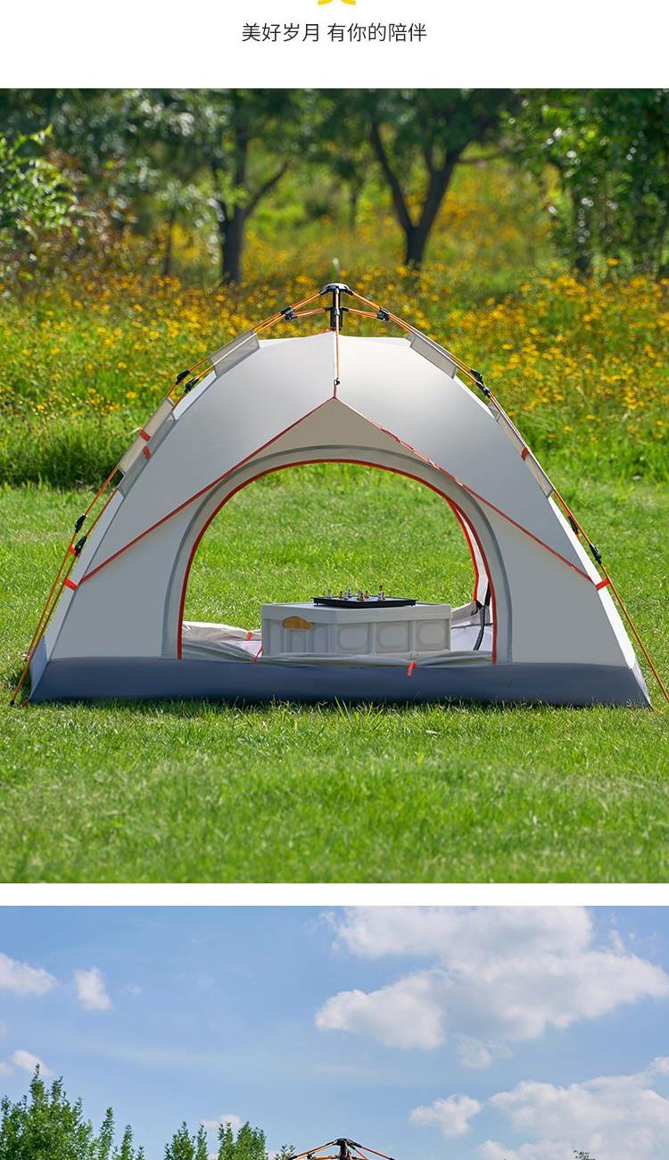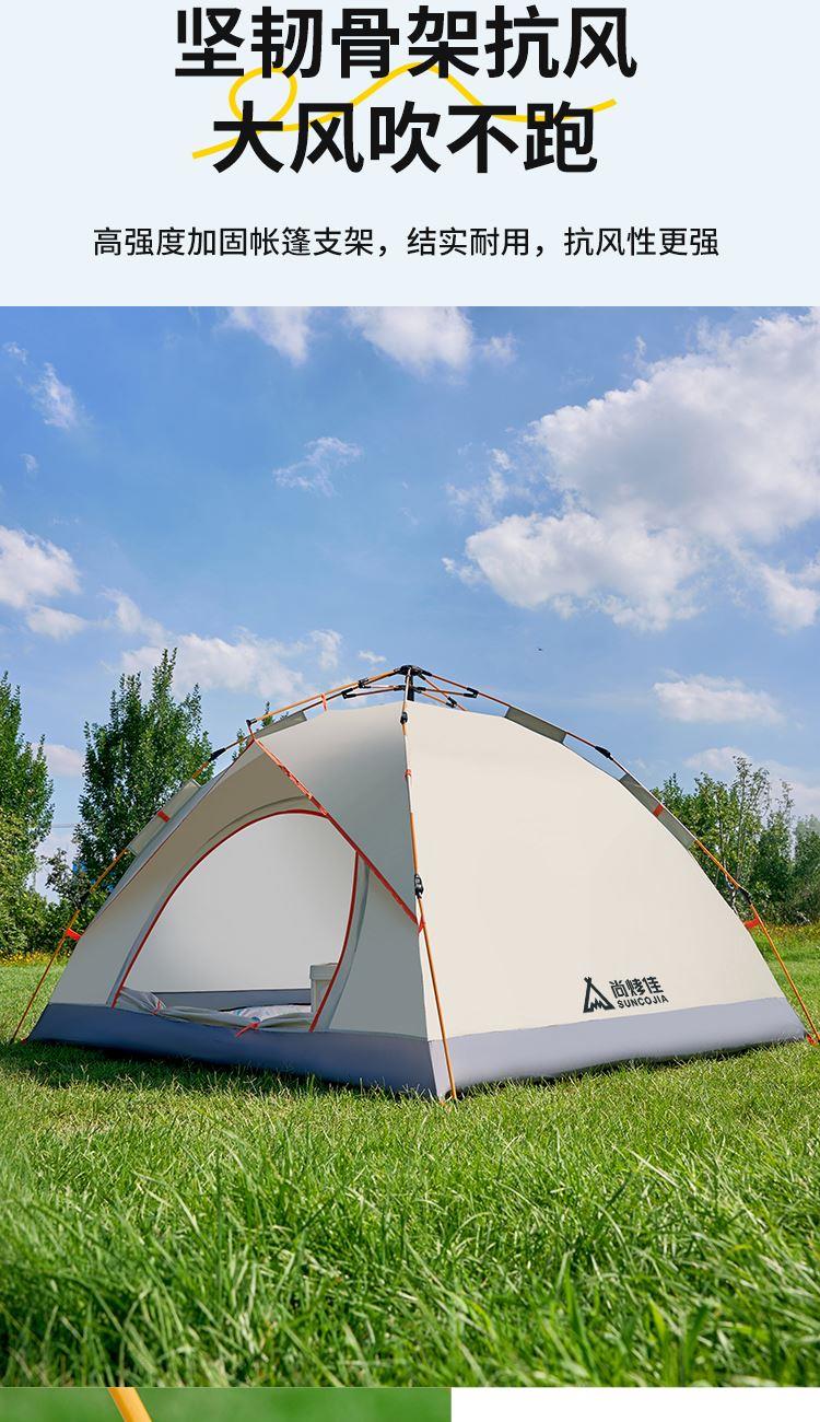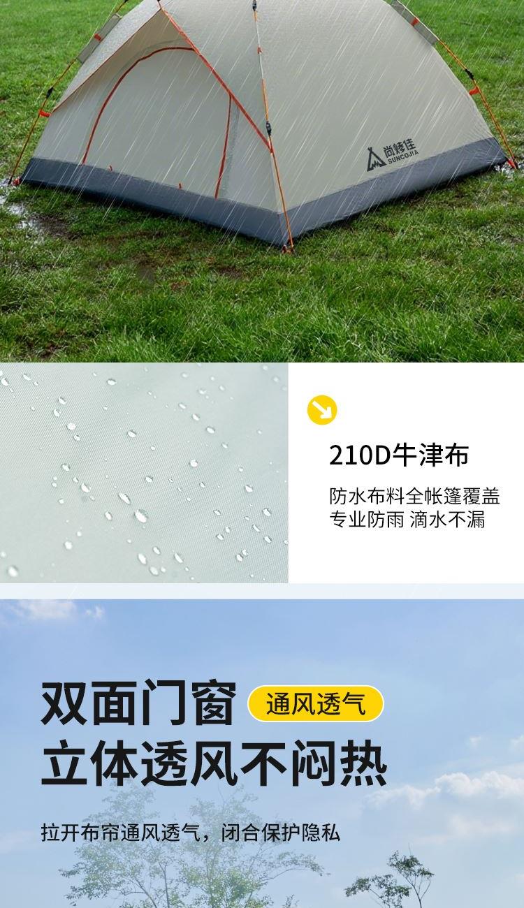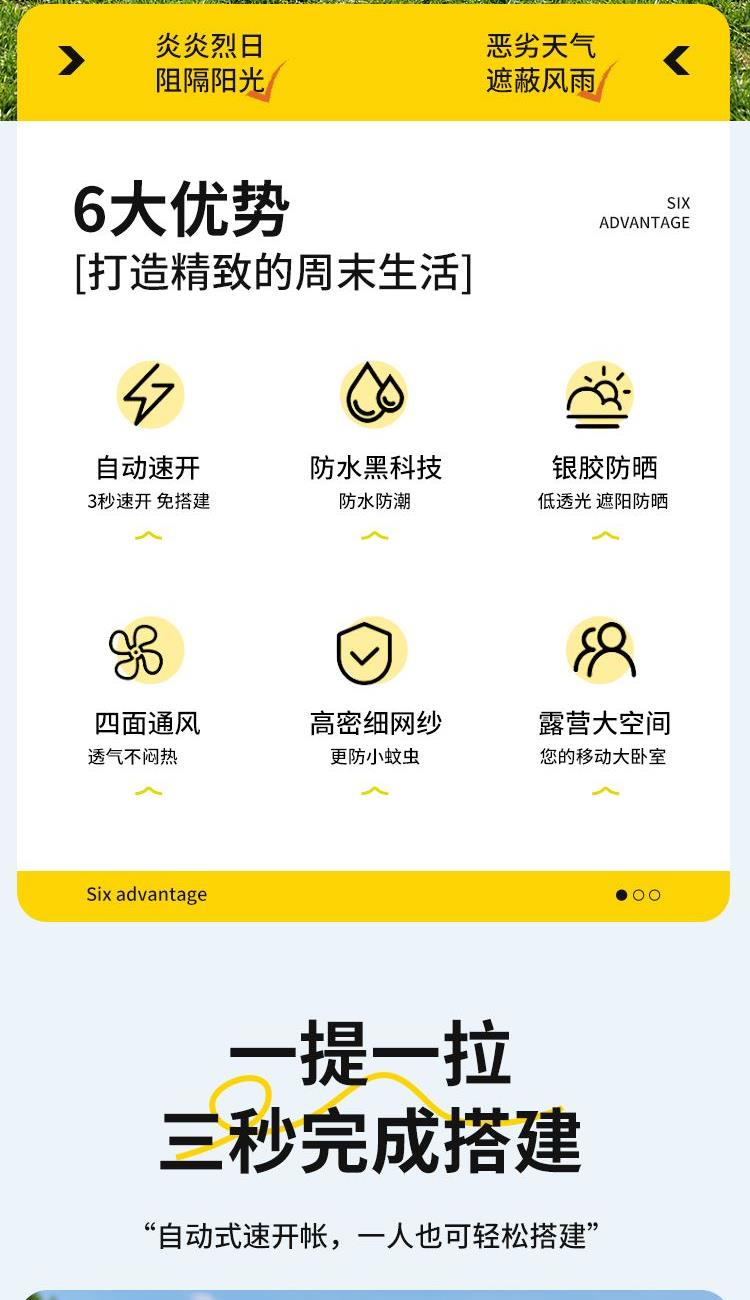产品材质 210D牛津布 产品重量 1.9KG 产品尺寸 展开尺寸:200x150x125cm收纳尺寸:66x15x15cm 产品配件 收纳袋、防潮垫、地钉*4、风绳*4