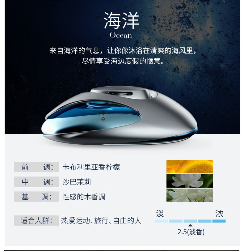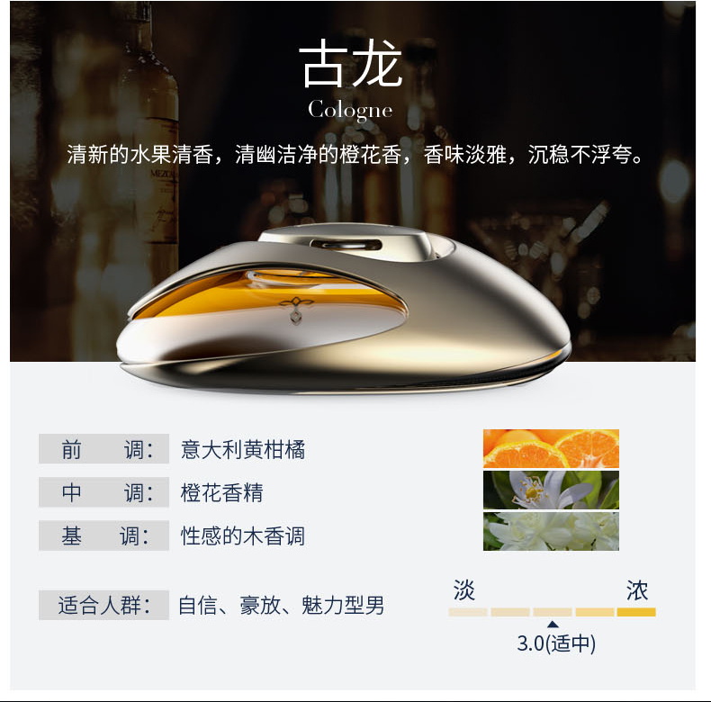 邂逅天使湾设计灵感来自法国地中海沿岸绚烂的海湾——天使湾,轻扬的弧形瓶身犹如天使的羽翼遥相呼应,温暖地拥抱着一片蔚蓝和金色的海岸,温柔中透露着性感。琥珀男士香水以浓郁复杂的琥珀香调为基础,搭配干净清新的百里香、茉莉、丁香,呈现出大胆清新、抽象神秘的阳刚性感味道。浓郁的琥珀香与清新的花果香形成对比,让此款香水充满惊奇和诱惑,为懂得欣赏复杂香味,有魅力的男士量身定制。