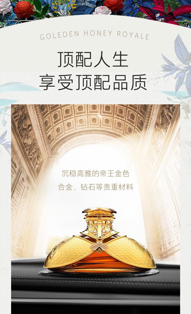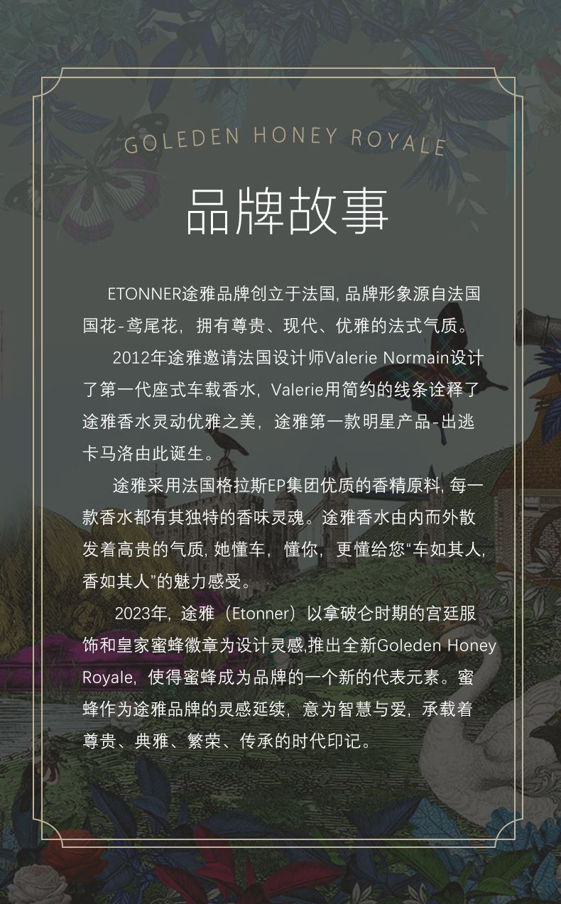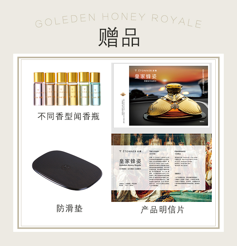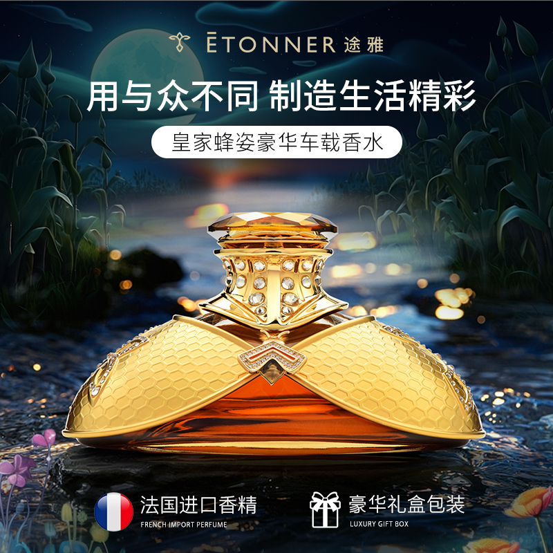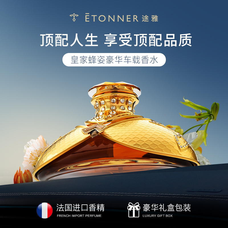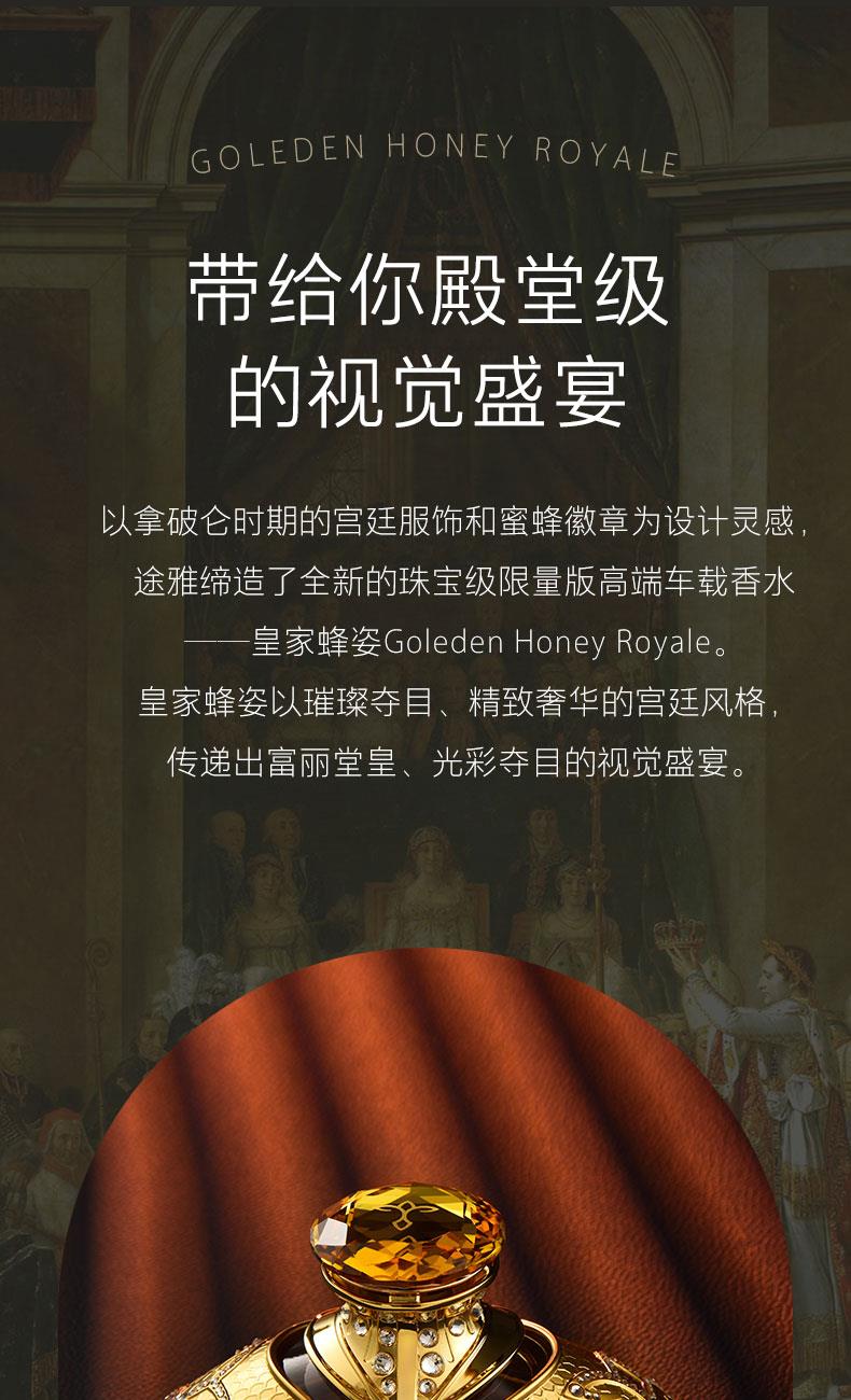 以拿破仑时期的宫廷服饰和蜜蜂徽章为设计灵感, 途雅缔造了全新的珠宝级限量版车载香水 ——皇家蜂姿Goleden Honey Royale。 皇家蜂姿以璀璨夺目、精致奢华的宫廷风格, 传递出富丽堂皇、光彩夺目的视觉盛宴 设计:法国设计师曾获红点设计大奖设计师设计 香料:法国格拉斯PE集团直供优质香料 工艺:珠宝级锻造工艺 标配:瓶内90ML香水+赠帝王蜂项链或领扣 (24K真金镀 镶130颗闪钻) 法国香水蜜蜂项链或领扣;旗舰版专用6支香水试用装 5种香型:绅士古龙C,冒险家的丛林J,琥珀男士A,仲夏夜之梦N,雨后初晴W,