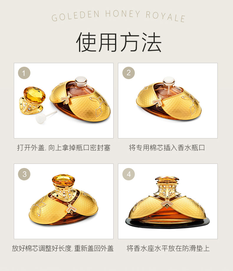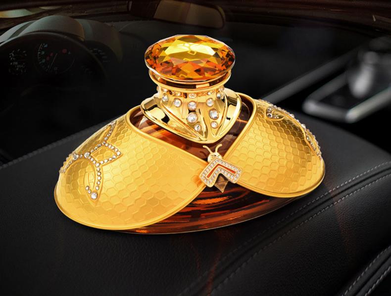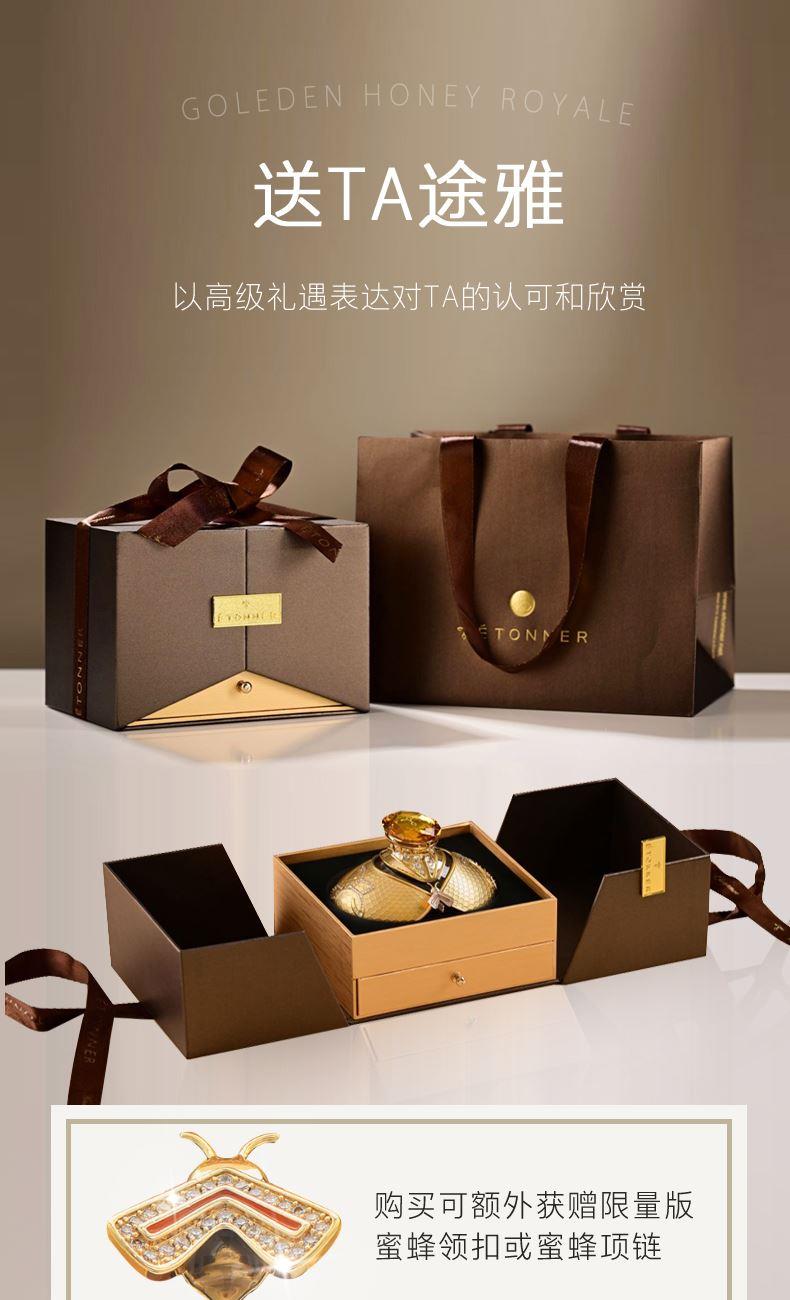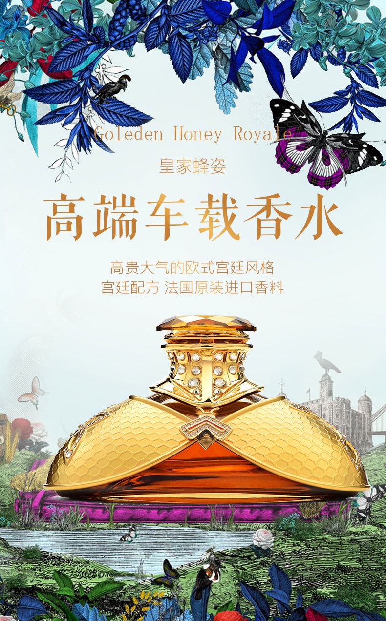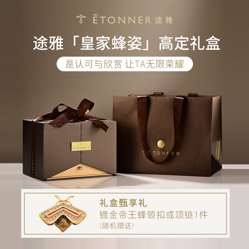 以拿破仑时期的宫廷服饰和蜜蜂徽章为设计灵感, 途雅缔造了全新的珠宝级限量版车载香水 ——皇家蜂姿Goleden Honey Royale。 皇家蜂姿以璀璨夺目、精致奢华的宫廷风格, 传递出富丽堂皇、光彩夺目的视觉盛宴 设计:法国设计师曾获红点设计大奖设计师设计 香料:法国格拉斯PE集团直供优质香料 工艺:珠宝级锻造工艺 标配:瓶内90ML香水+赠帝王蜂项链或领扣 (24K真金镀 镶130颗闪钻) 法国香水蜜蜂项链或领扣;旗舰版专用6支香水试用装 5种香型:绅士古龙C,冒险家的丛林J,琥珀男士A,仲夏夜之梦N,雨后初晴W,