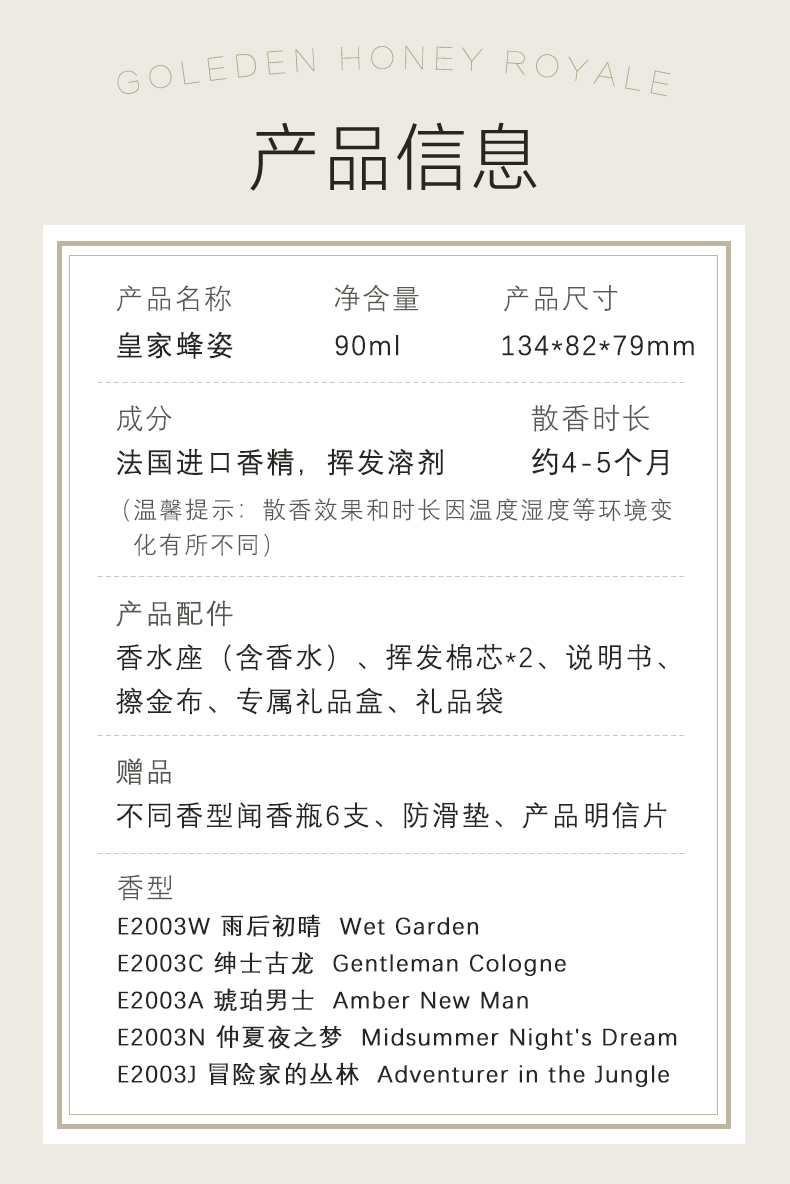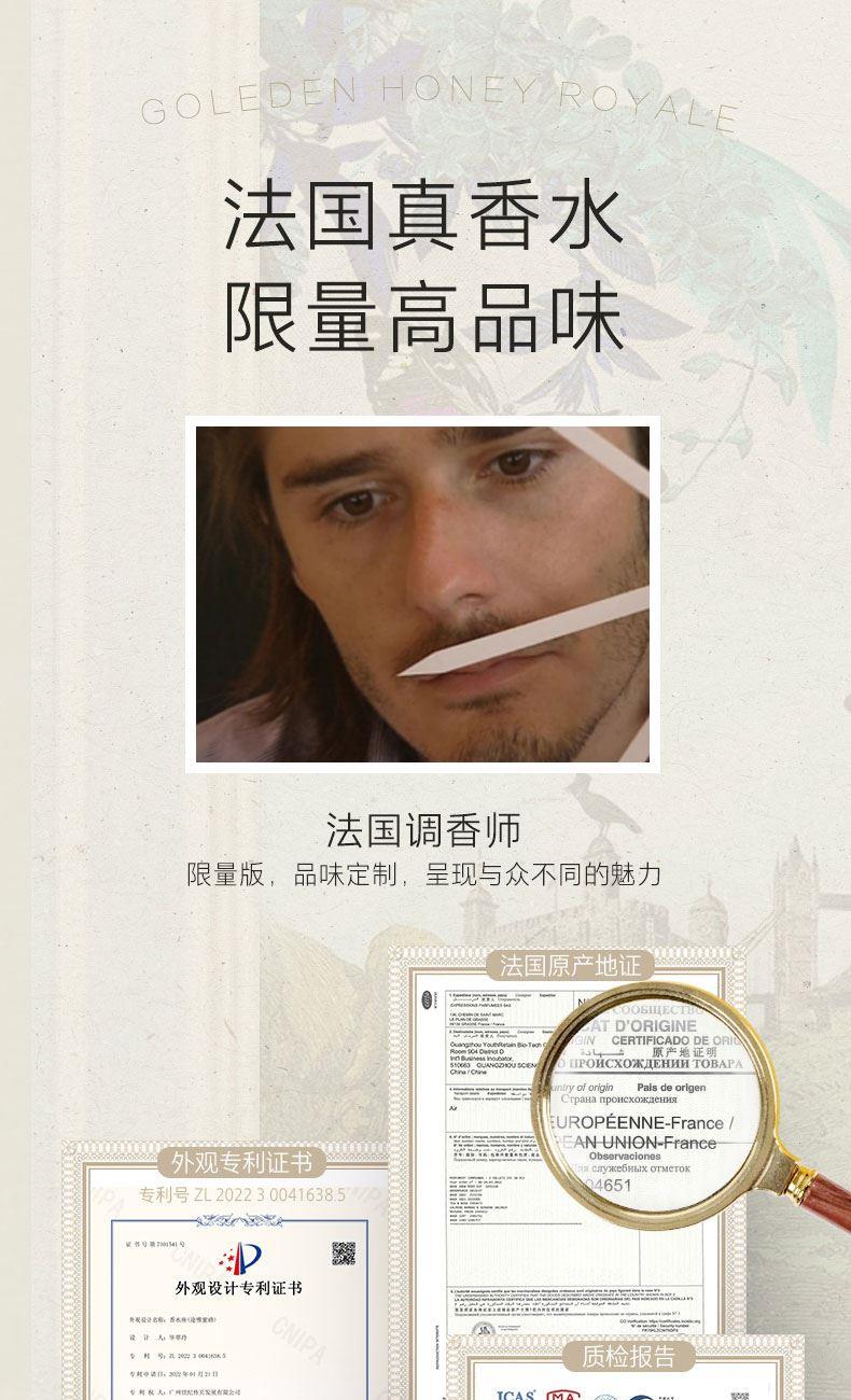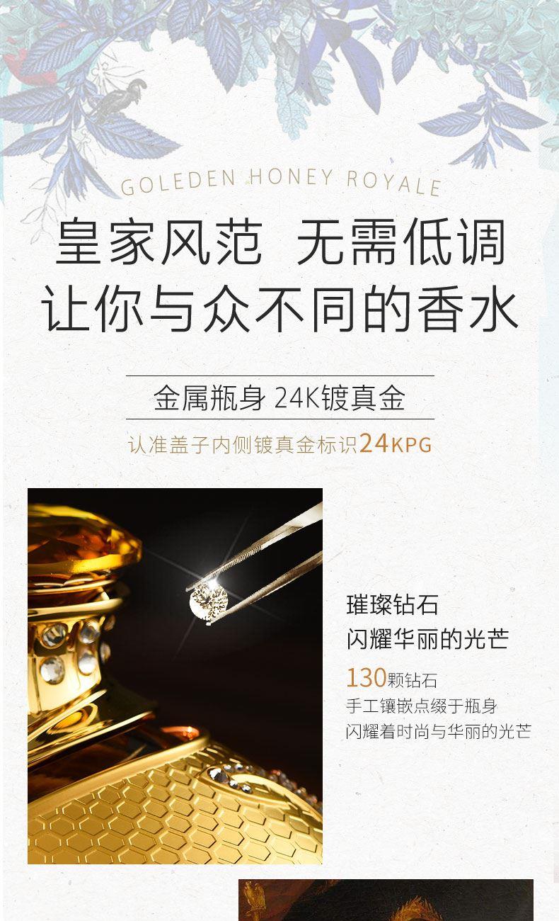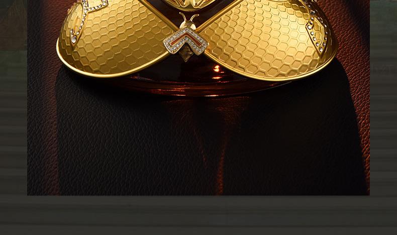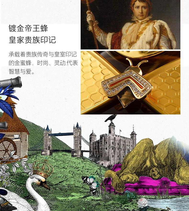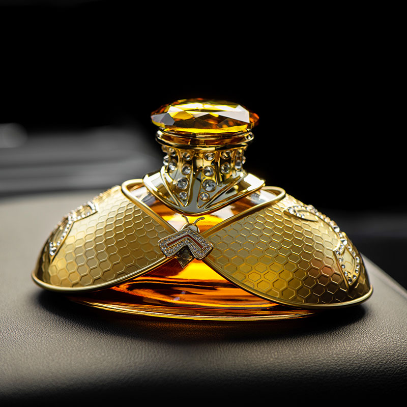 以拿破仑时期的宫廷服饰和蜜蜂徽章为设计灵感, 途雅缔造了全新的珠宝级限量版车载香水 ——皇家蜂姿Goleden Honey Royale。 皇家蜂姿以璀璨夺目、精致奢华的宫廷风格, 传递出富丽堂皇、光彩夺目的视觉盛宴 设计:法国设计师曾获红点设计大奖设计师设计 香料:法国格拉斯PE集团直供优质香料 工艺:珠宝级锻造工艺 标配:瓶内90ML香水+赠帝王蜂项链或领扣 (24K真金镀 镶130颗闪钻) 法国香水蜜蜂项链或领扣;旗舰版专用6支香水试用装 5种香型:绅士古龙C,冒险家的丛林J,琥珀男士A,仲夏夜之梦N,雨后初晴W,