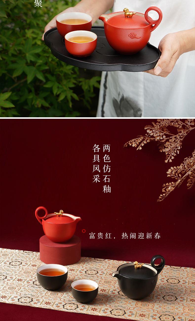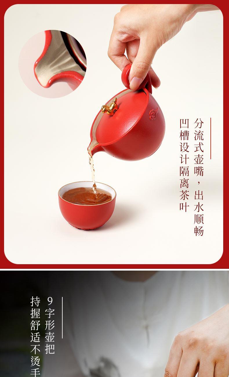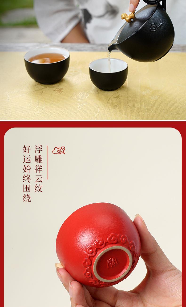 马,自古为祥瑞之象,踏云而行,送来财富、成功与安康。将美好心意凝于陶礼之中,愿您与幸福「马」上相逢,财富「马」上拥有,好运「马」上抵达。 以金马和祥云入器,创作「马上走运」茶组,为茶生活注入鸿运当头、如意年年的吉祥美意。萌趣马驹立于茶器上,彷佛自茶香中跃出,洋溢蓬勃朝气与无限喜悦。细致雕琢的祥云纹,喻示好运马上来、福气马上到。大小双杯,巧妙套叠于壶中,寓意圆满叠至、福气相随。 新的一年,携好运、启新程,满载马上走运的祝福,每一天都奔跑在灿烂的前程里。 规格:壶×1,大杯×1,小杯×1,活水球×1 颜色:富贵红/禅风黑 容量:180ml