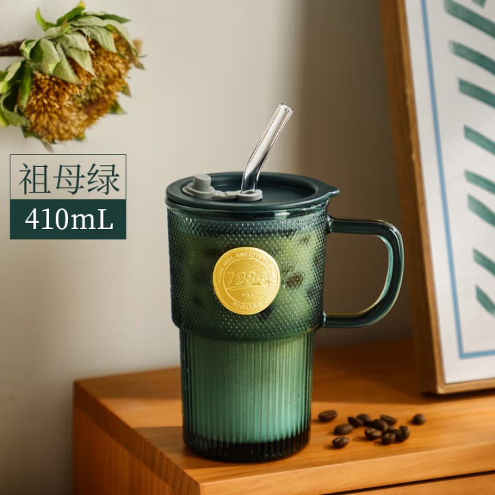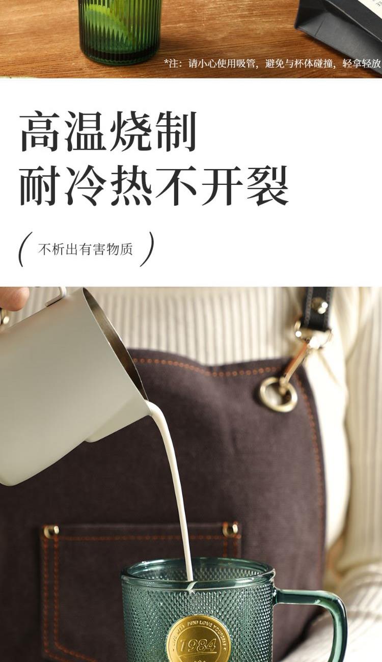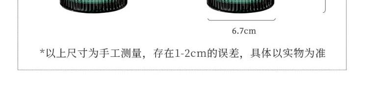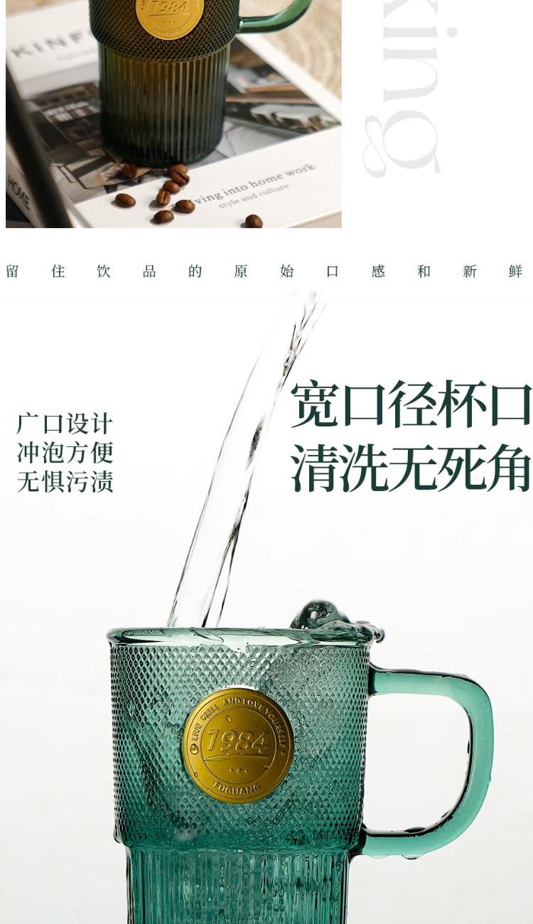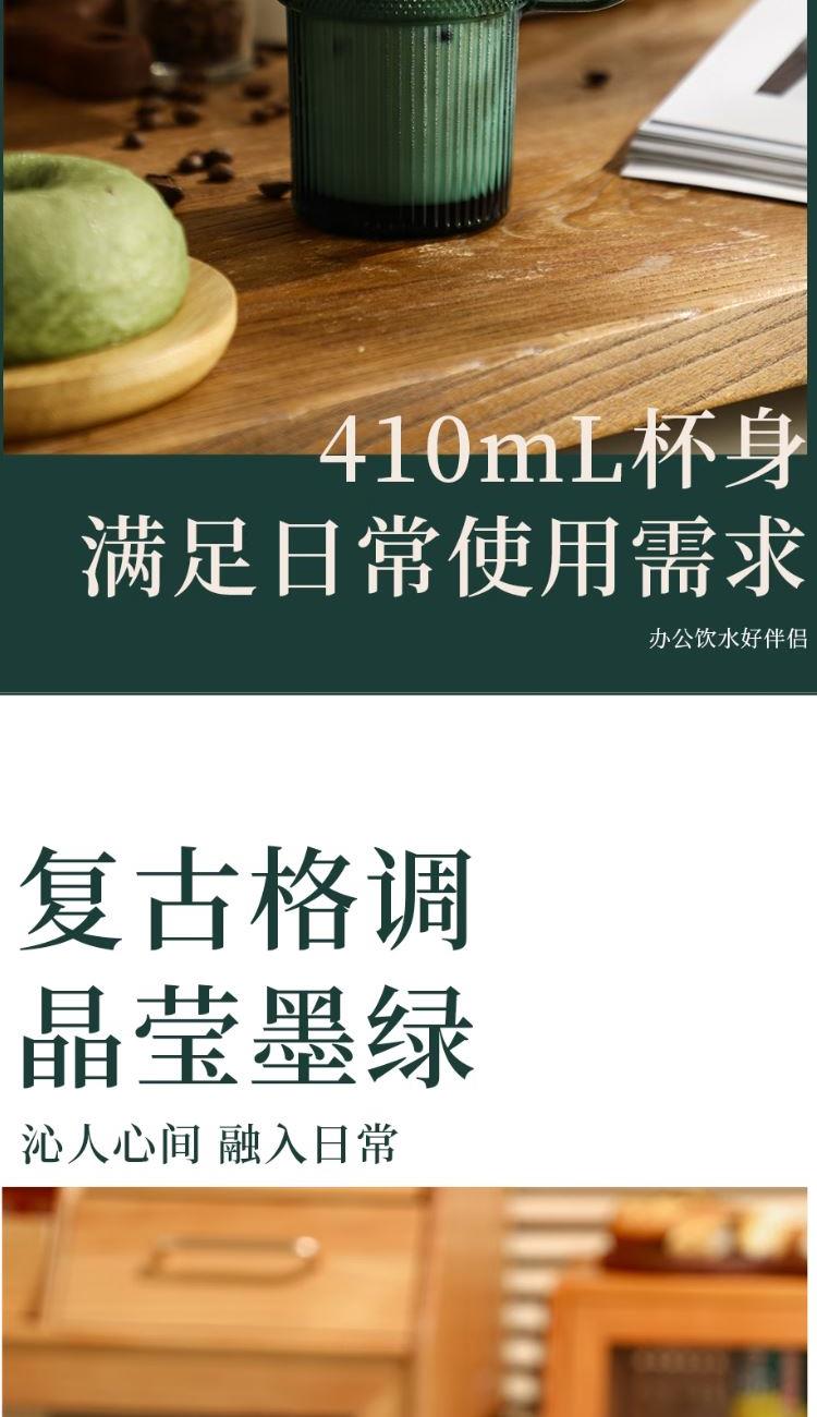 颜色:绿色 容量:410ml 尺寸:86*137mm 材质:玻璃材质,通透晶莹的无铅玻璃,几何杯身经典造型,浮雕工艺非同一般的手感。两种容量设计。 包装:单瓦盒