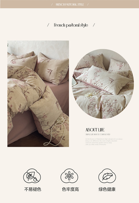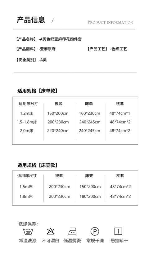 1:高克重亚麻原麻面料,高克重面料,透气性能良好 且拥有吸湿快干的性能贴肤舒适 已然成了好眠的宝藏 2:高支高密织造云般享受。 纱线的密度越高纱线越细面料就越柔软舒适对原料品质要求也越高 被套:200*230cm*1 床单:240*245cm*1 枕套:48*74cm*2 包装:彩盒