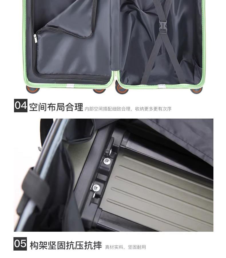 线条硬朗明显,均衡分散受力,增固抗压双重; 顺滑静音,灵活平纹,减震降噪; 安全便捷,稳妥可靠; 材质: ABS+PC 产品配锁:三位密码锁 轮子:静音万向轮 拉杆:合金拉杆 颜色:黑色、绿色 尺寸:20英寸