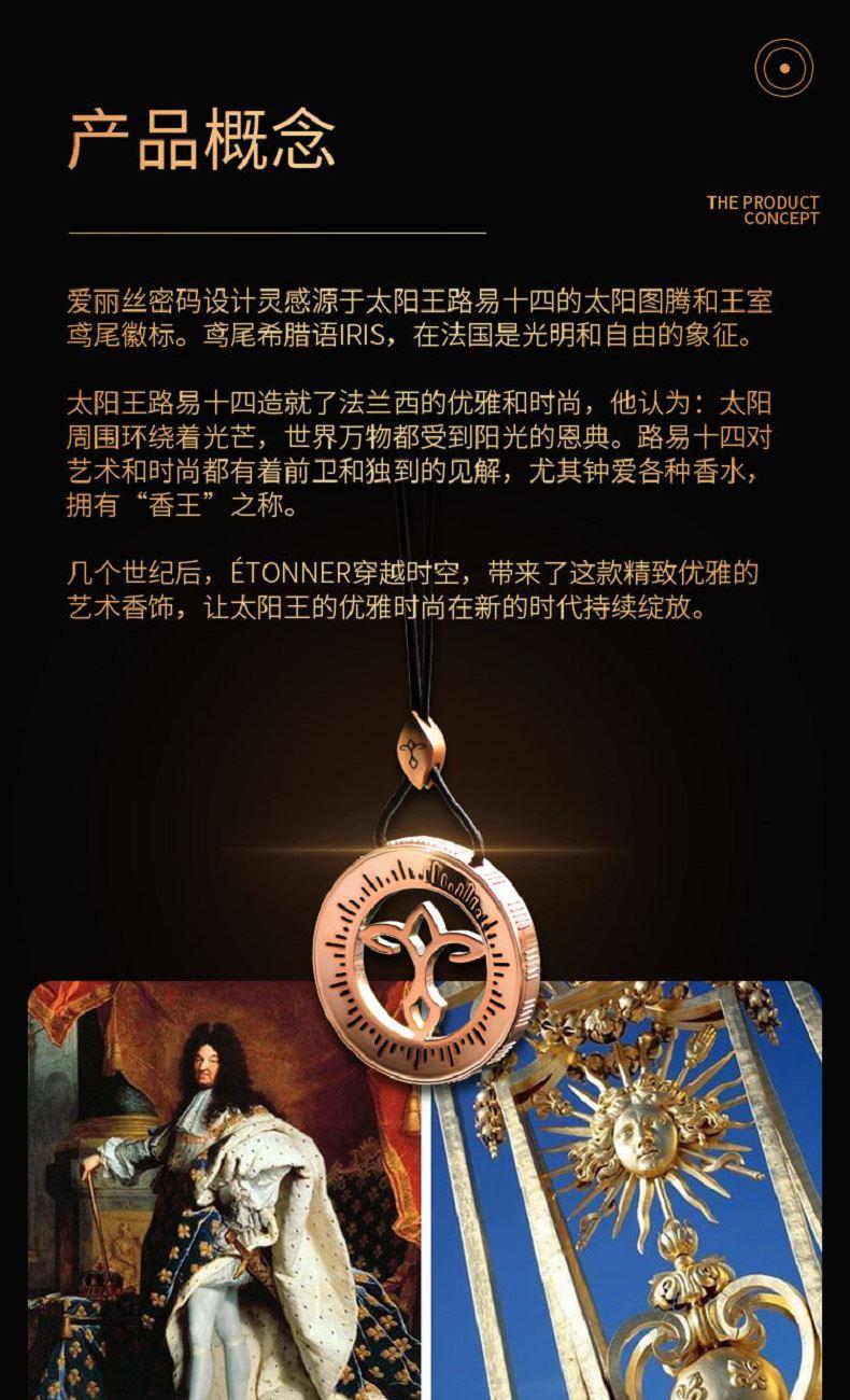 爱丽丝密码设计灵感源于太阳王路易十四的太阳图腾和王室鸢尾徽标。鸢尾希腊语Iris,在法国是光明和自由的象征。太阳王路易十四造就了法兰西的优雅和时尚,他认为:太阳周围环绕着光芒,世界万物都受到阳光的恩典。路易十四对艺术和时尚都有着前卫和独到的见解,尤其钟爱各种香水,拥有“香王”之称。几个世纪后,Étonner穿越时空,带来了这款精致优雅的艺术香饰,让太阳王的优雅时尚在新的时代持续绽放。