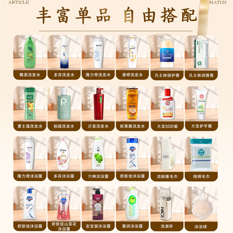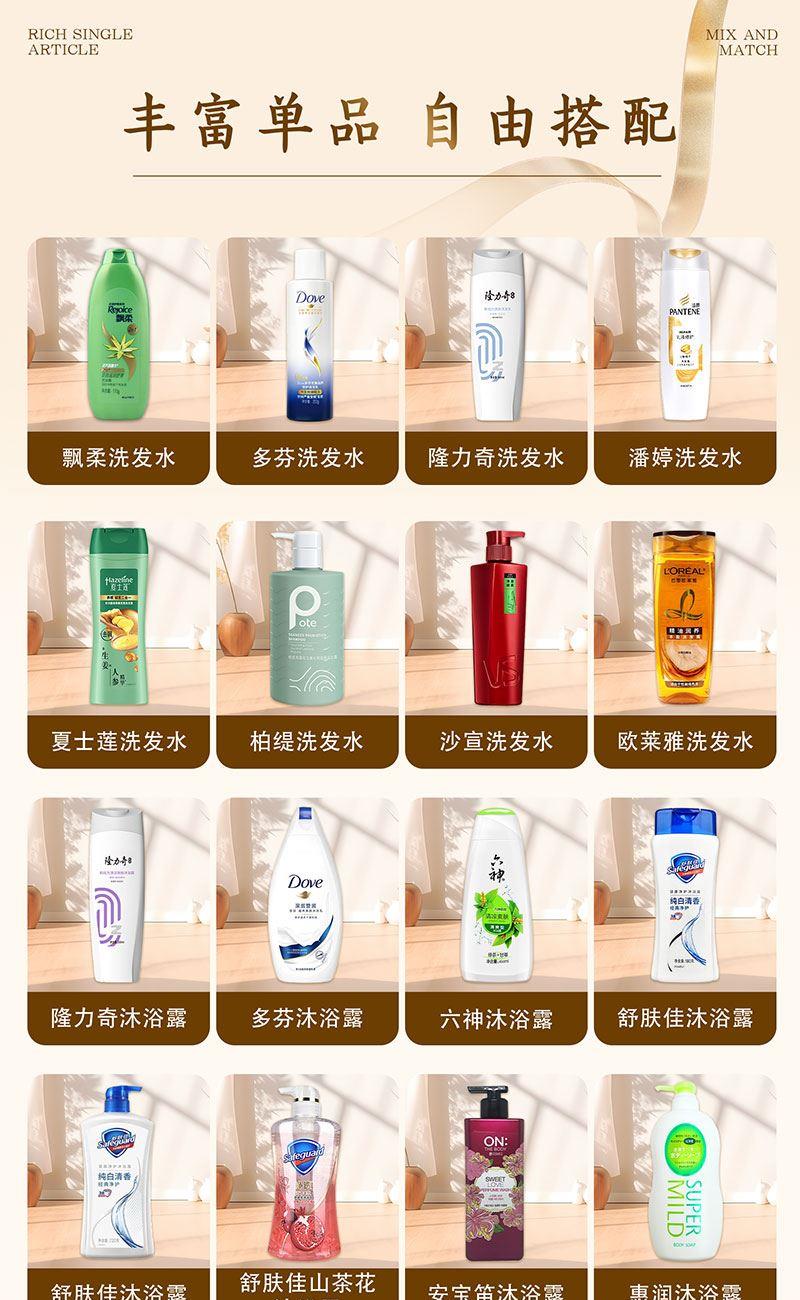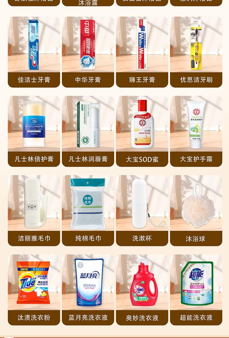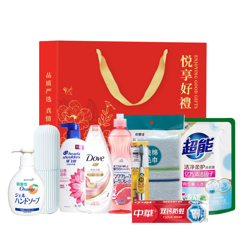 礼盒尺寸:32*8.5*24.5cm 包装尺寸:66*46.5*51CM 产品配置:(香型随机) 火箭洗洁精600ml animo洗手液200ml 超能洗衣液1kg 海飞丝洗发水300ml 多芬沐浴露300ml 中华牙膏90g 优思洁牙刷 纯棉毛巾 洗漱杯