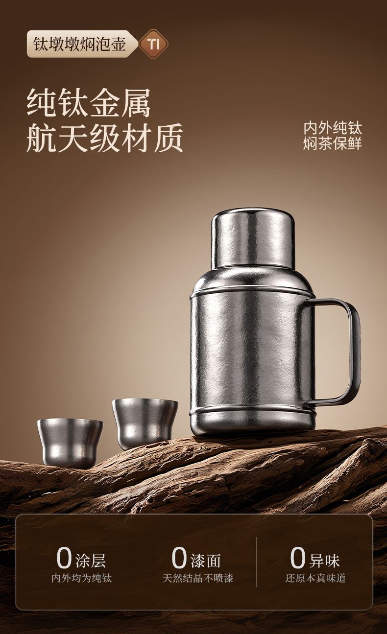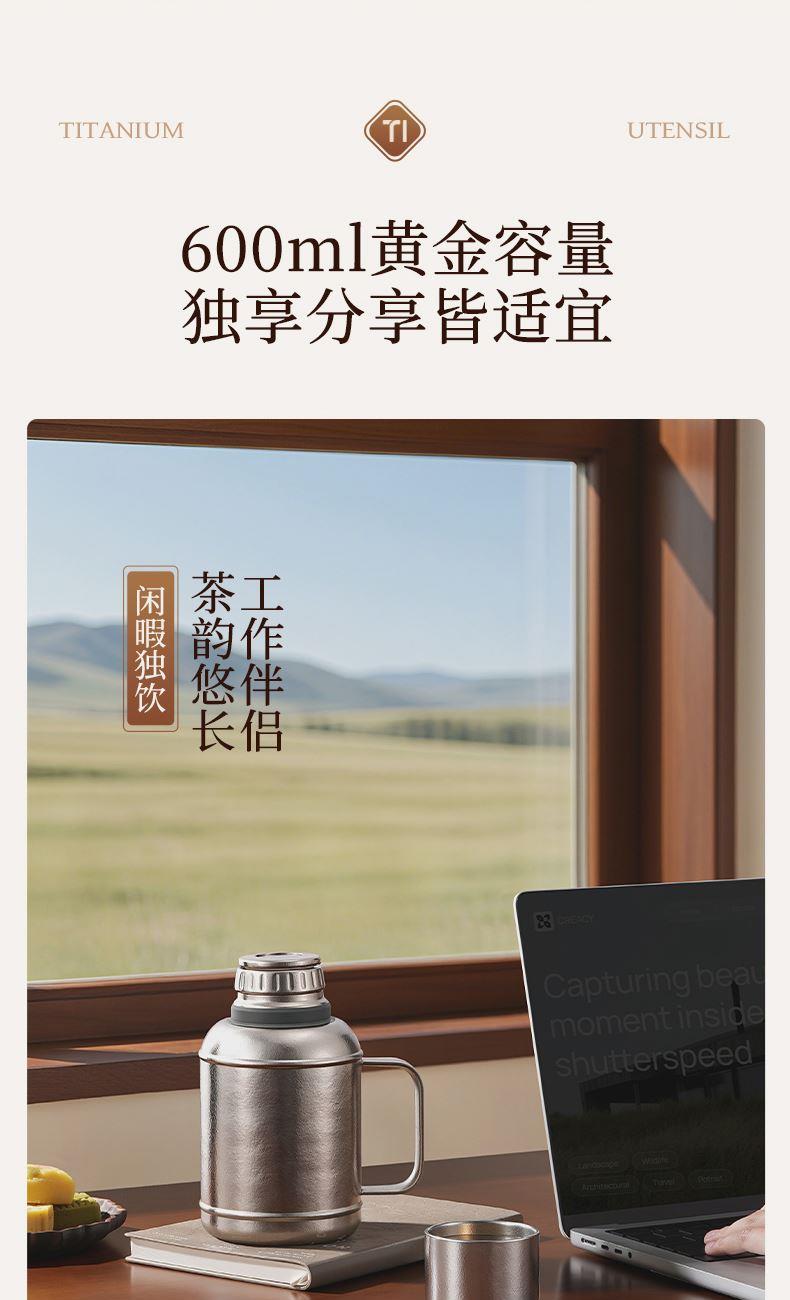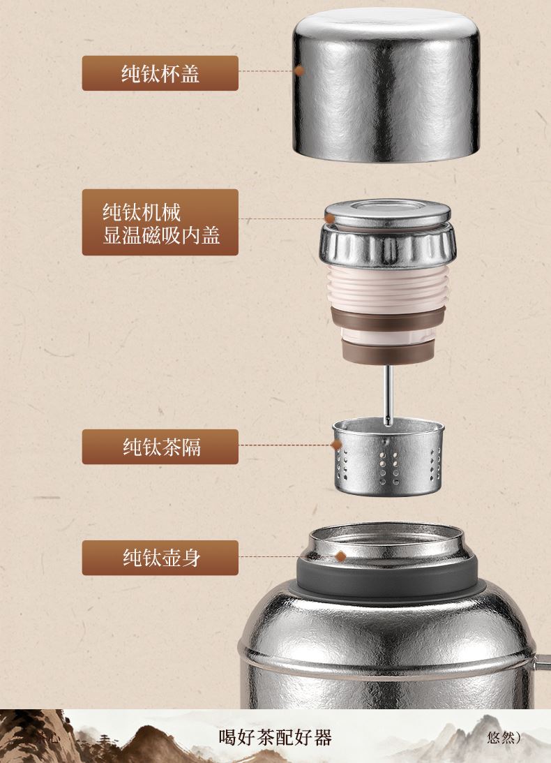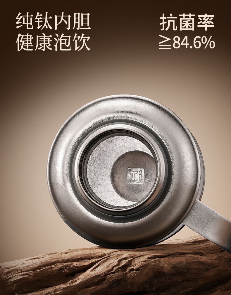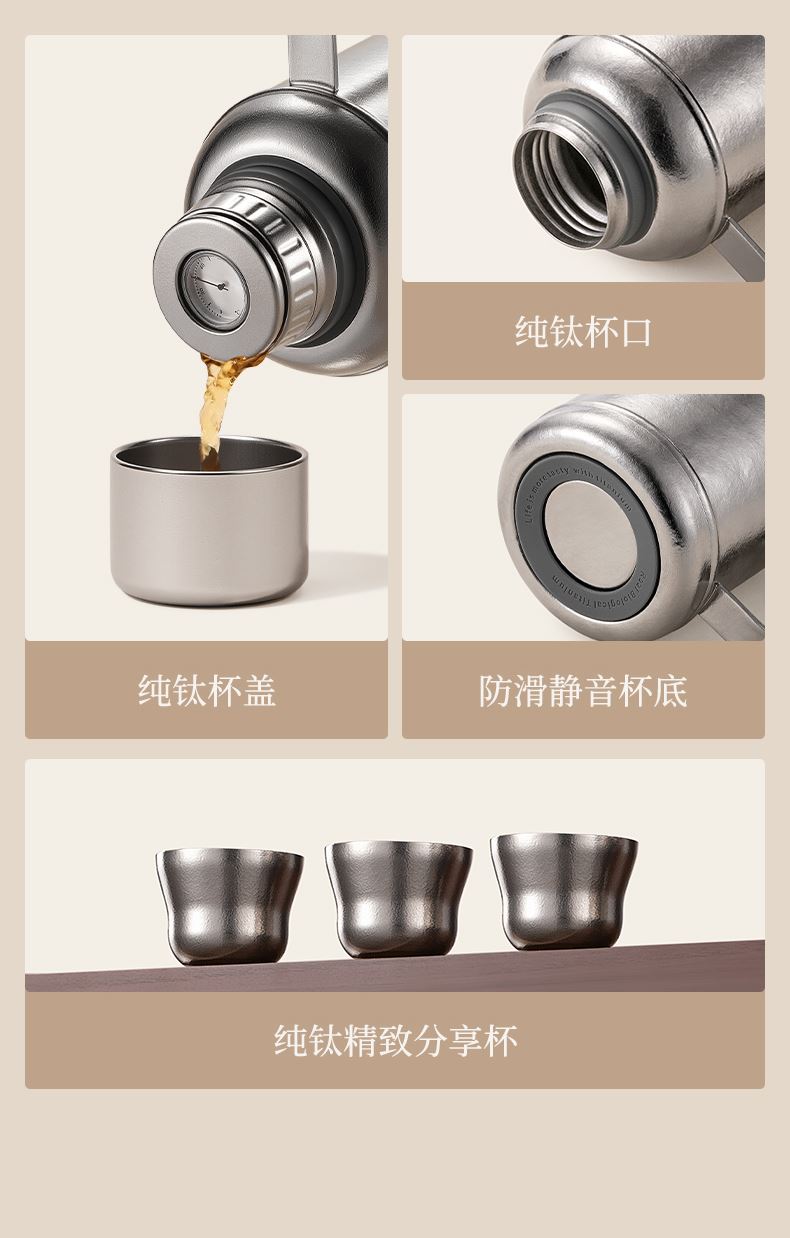 0涂层0漆面0异味 钛含量99.8% 健康泡茶 保温时间12-24H高于普通保温杯 600ml黄金大容量附赠三只35ml小茶杯,独享分享皆适宜 防滑静音杯底、体积小、重量轻在哪用都合适 内外全钛 一壶三杯 礼盒包装 高温锤炼成色 按盖出水 磁吸杯盖 机械温显 航天级材质 焖茶保鲜 权威检测 长效保温