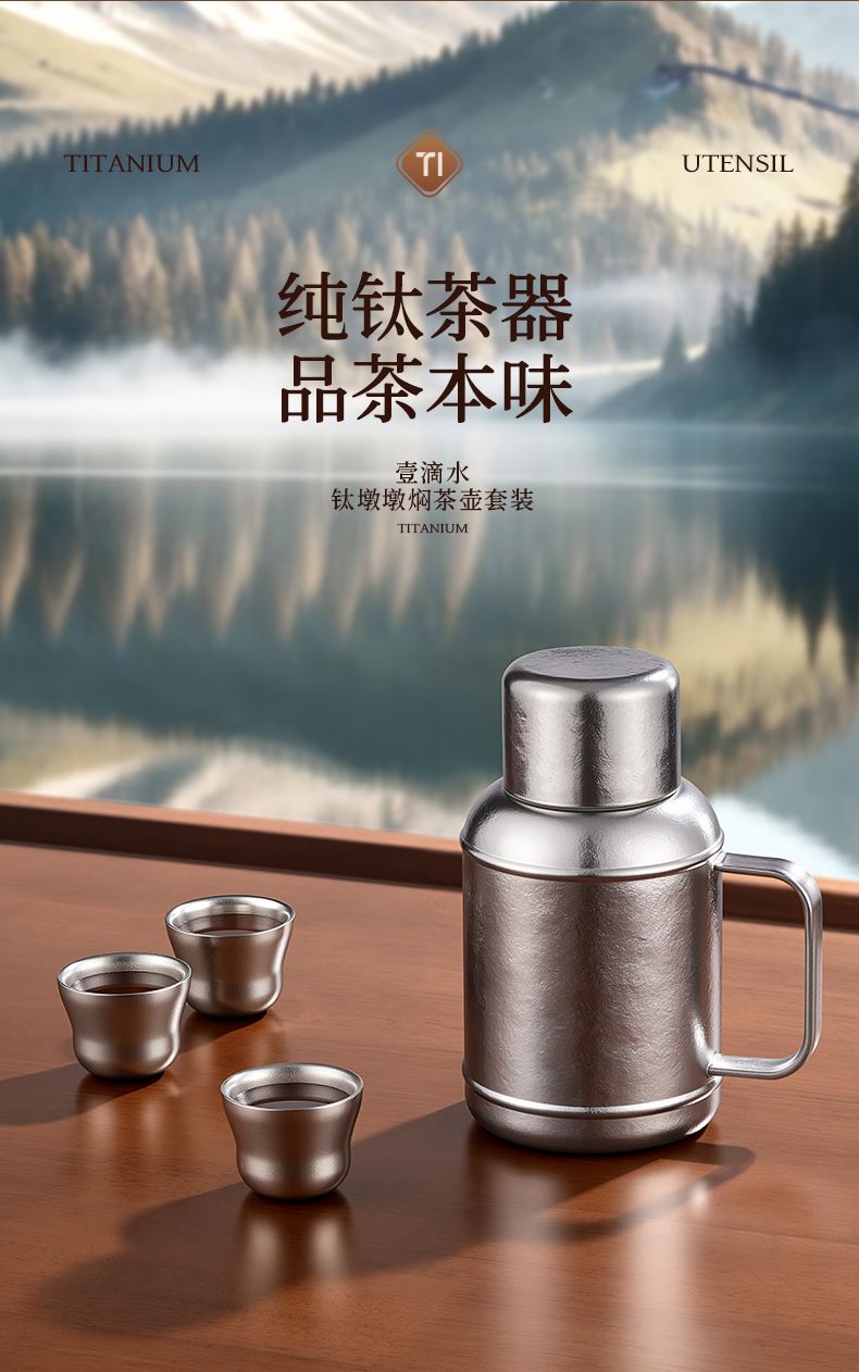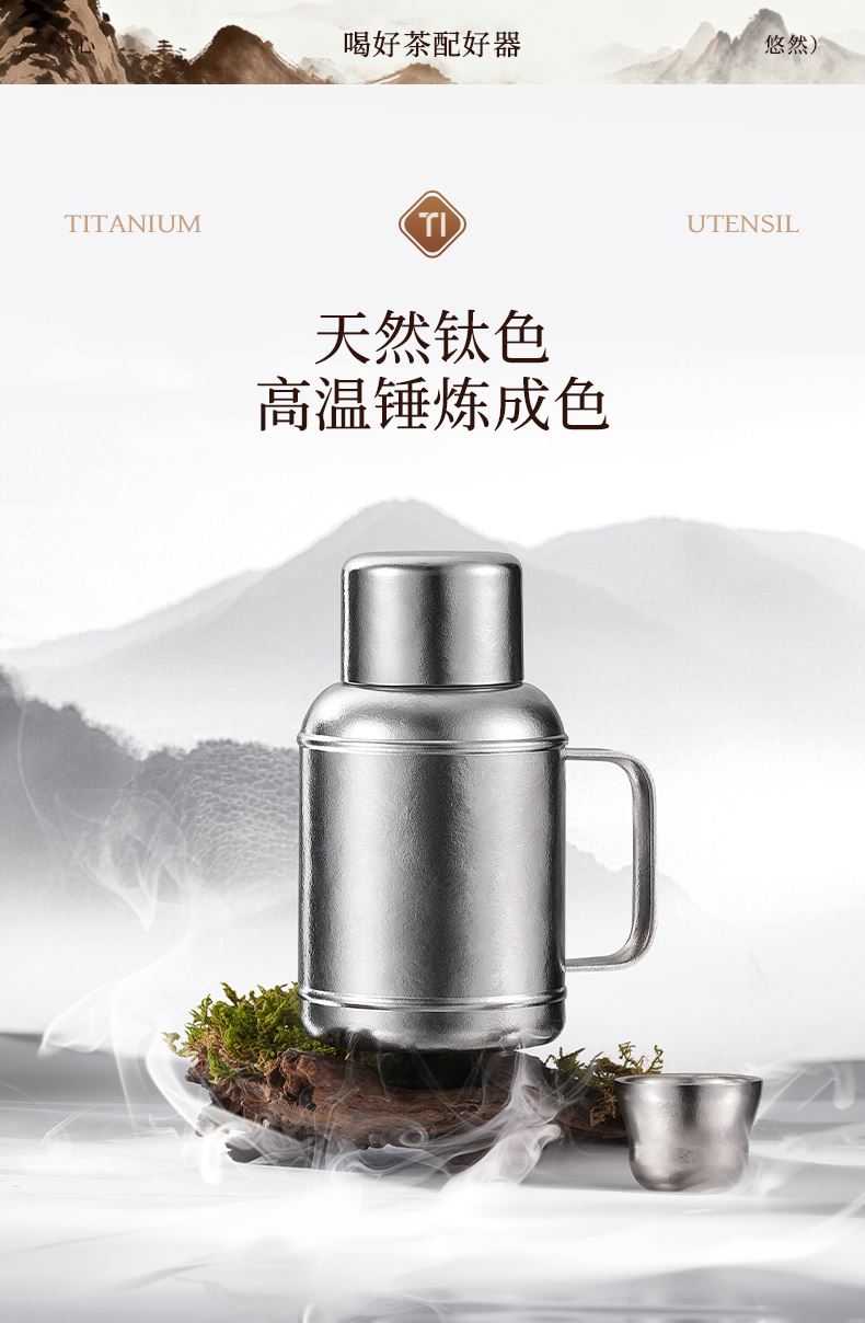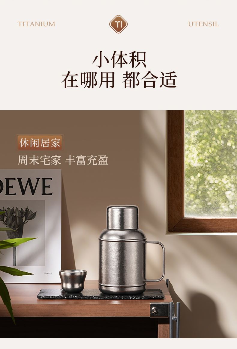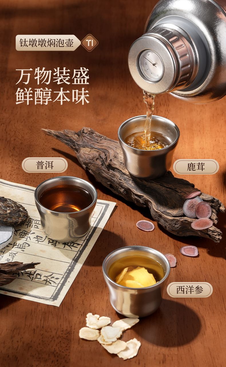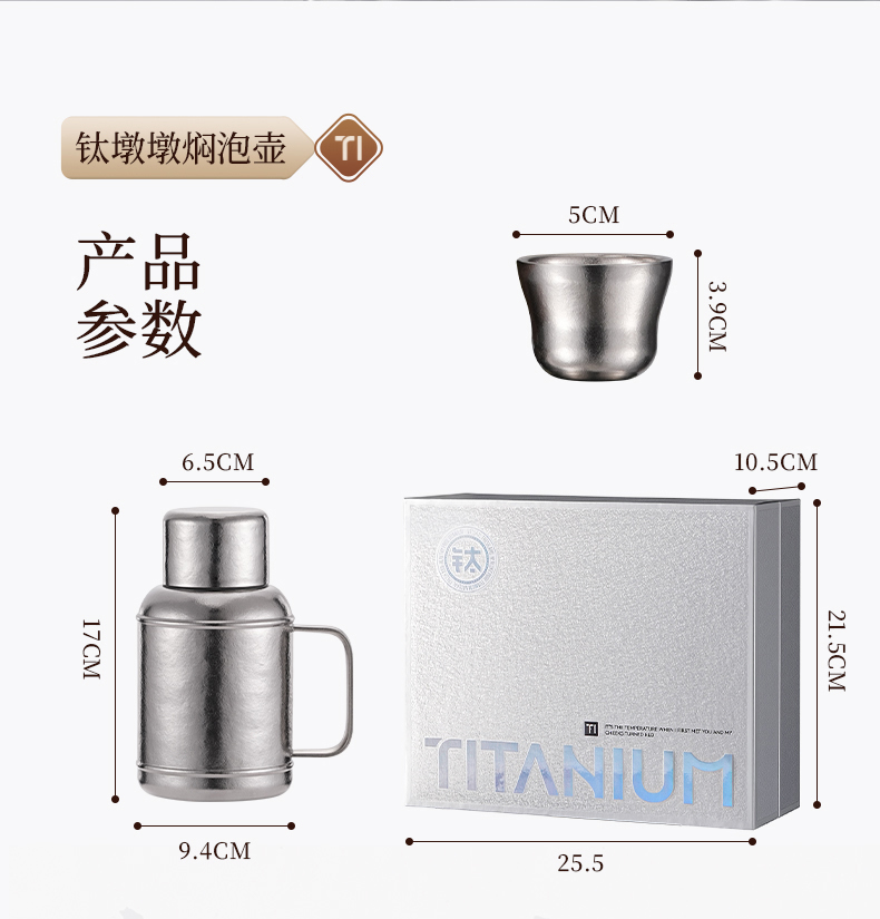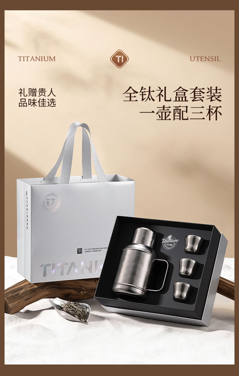 0涂层0漆面0异味 钛含量99.8% 健康泡茶 保温时间12-24H高于普通保温杯 600ml黄金大容量附赠三只35ml小茶杯,独享分享皆适宜 防滑静音杯底、体积小、重量轻在哪用都合适 内外全钛 一壶三杯 礼盒包装 高温锤炼成色 按盖出水 磁吸杯盖 机械温显 航天级材质 焖茶保鲜 权威检测 长效保温