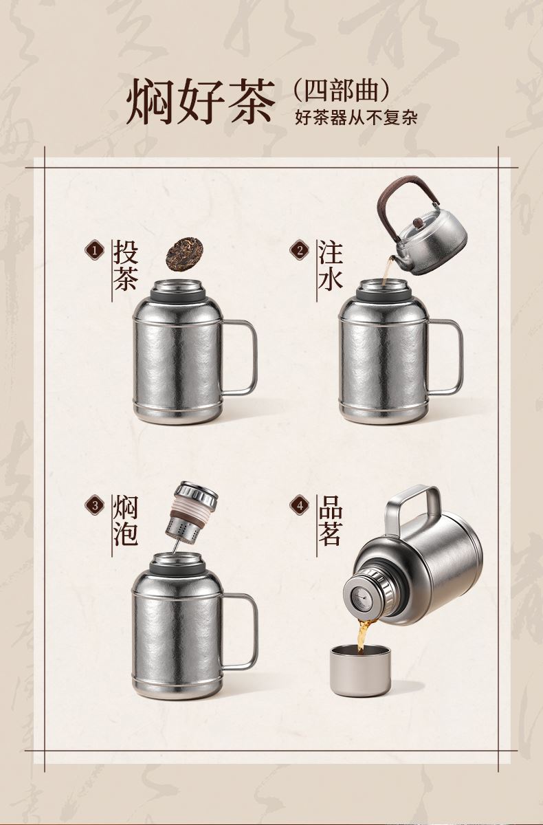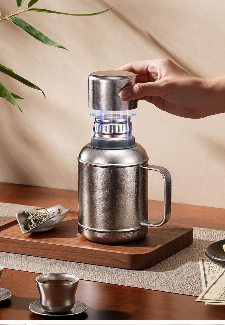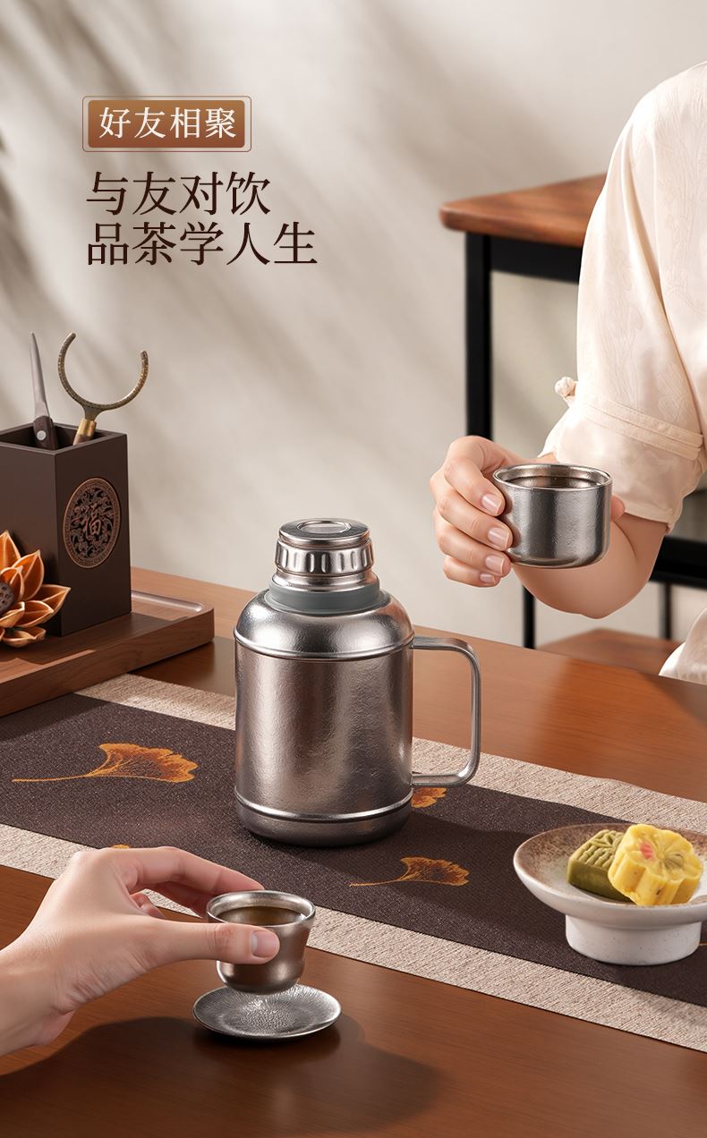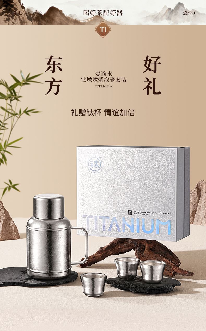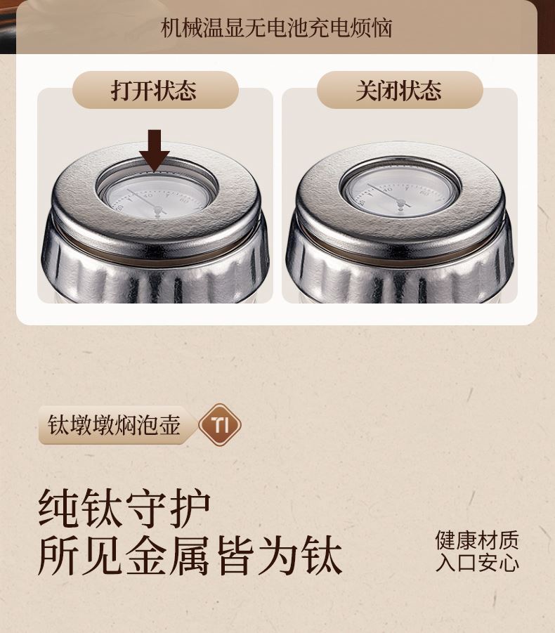 0涂层0漆面0异味 钛含量99.8% 健康泡茶 保温时间12-24H高于普通保温杯 600ml黄金大容量附赠三只35ml小茶杯,独享分享皆适宜 防滑静音杯底、体积小、重量轻在哪用都合适 内外全钛 一壶三杯 礼盒包装 高温锤炼成色 按盖出水 磁吸杯盖 机械温显 航天级材质 焖茶保鲜 权威检测 长效保温