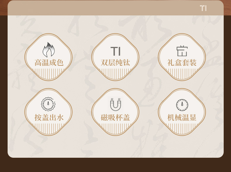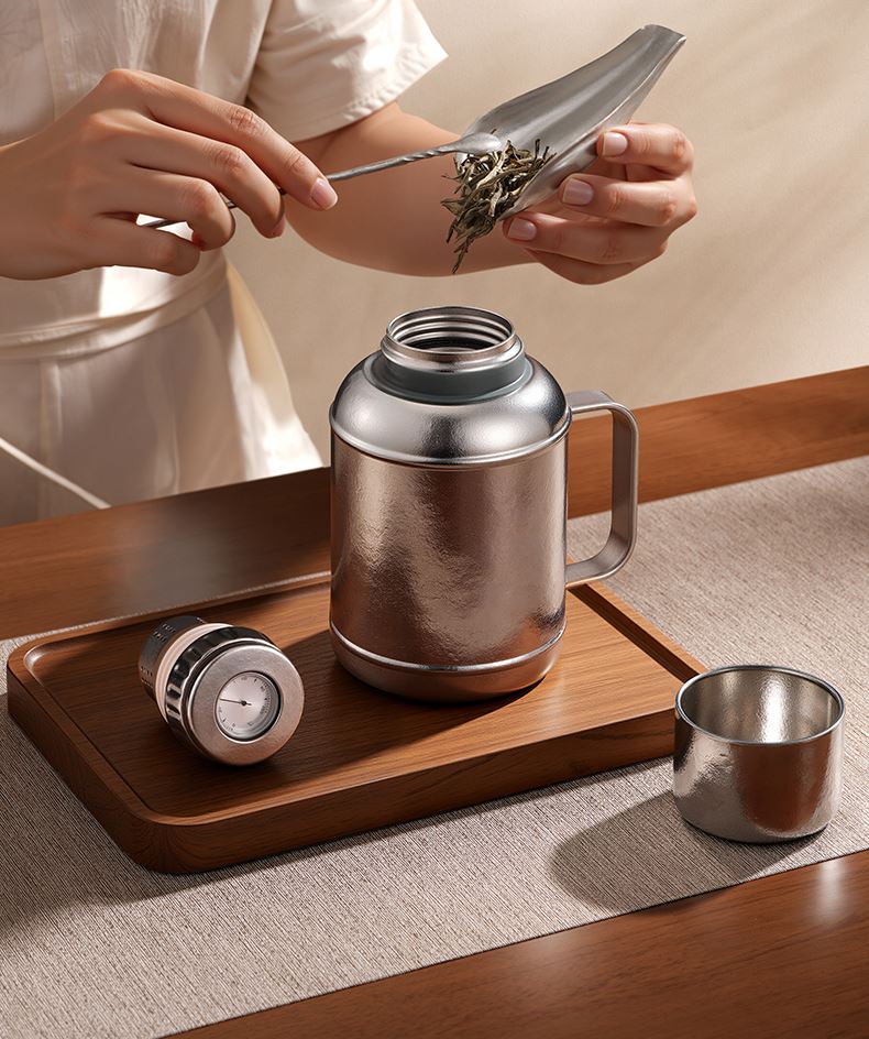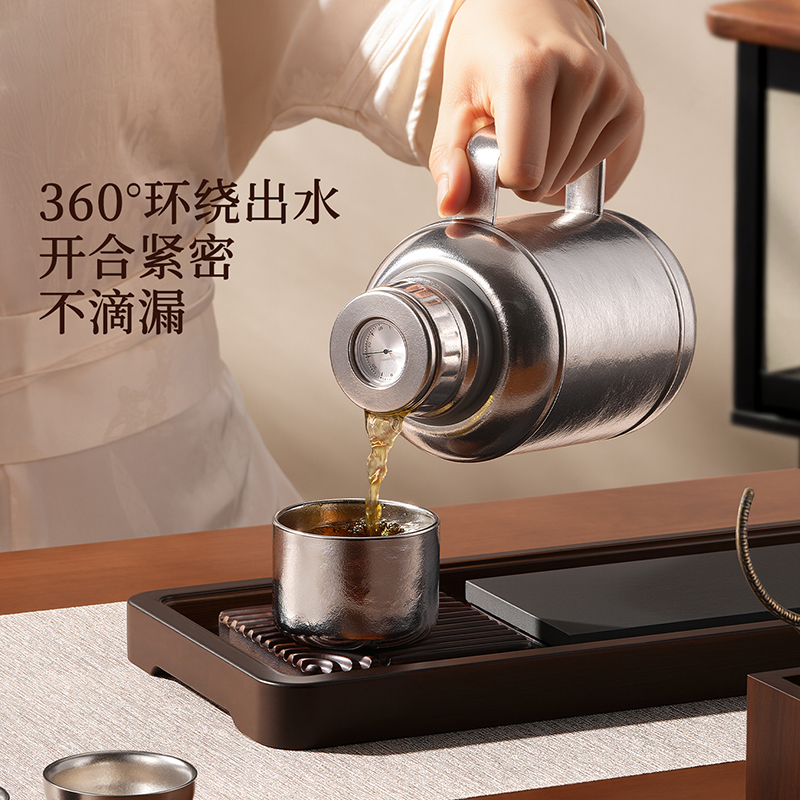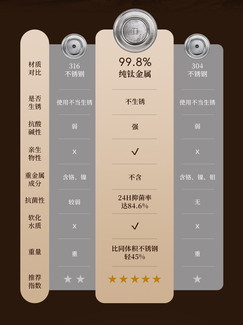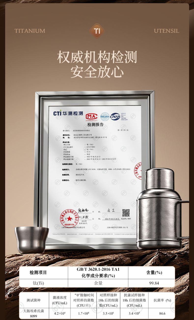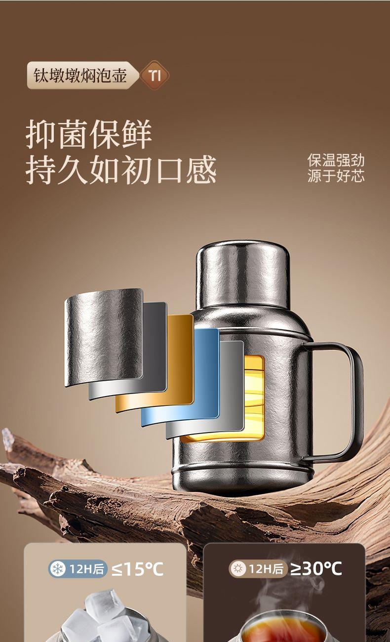 0涂层0漆面0异味 钛含量99.8% 健康泡茶 保温时间12-24H高于普通保温杯 600ml黄金大容量附赠三只35ml小茶杯,独享分享皆适宜 防滑静音杯底、体积小、重量轻在哪用都合适 内外全钛 一壶三杯 礼盒包装 高温锤炼成色 按盖出水 磁吸杯盖 机械温显 航天级材质 焖茶保鲜 权威检测 长效保温
