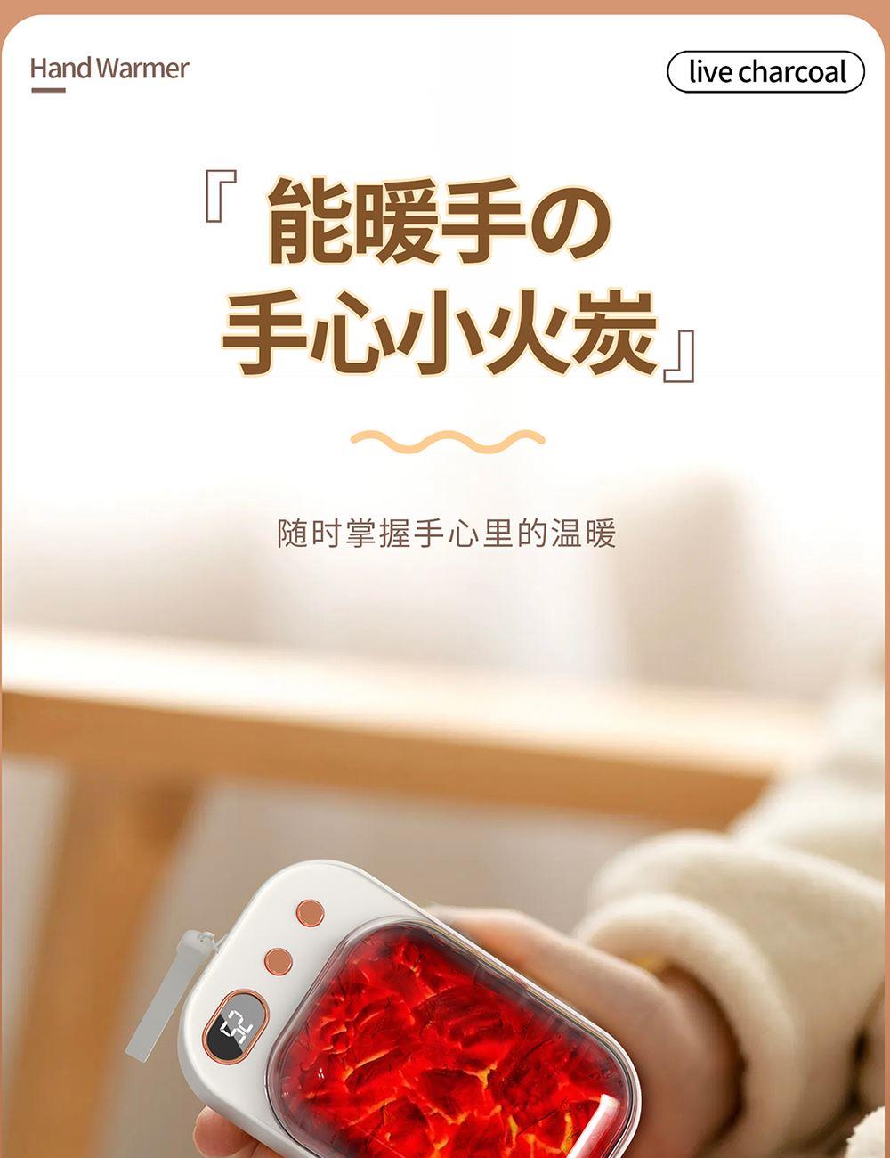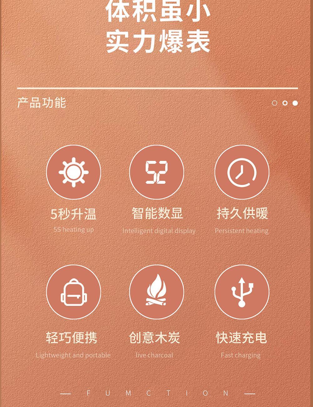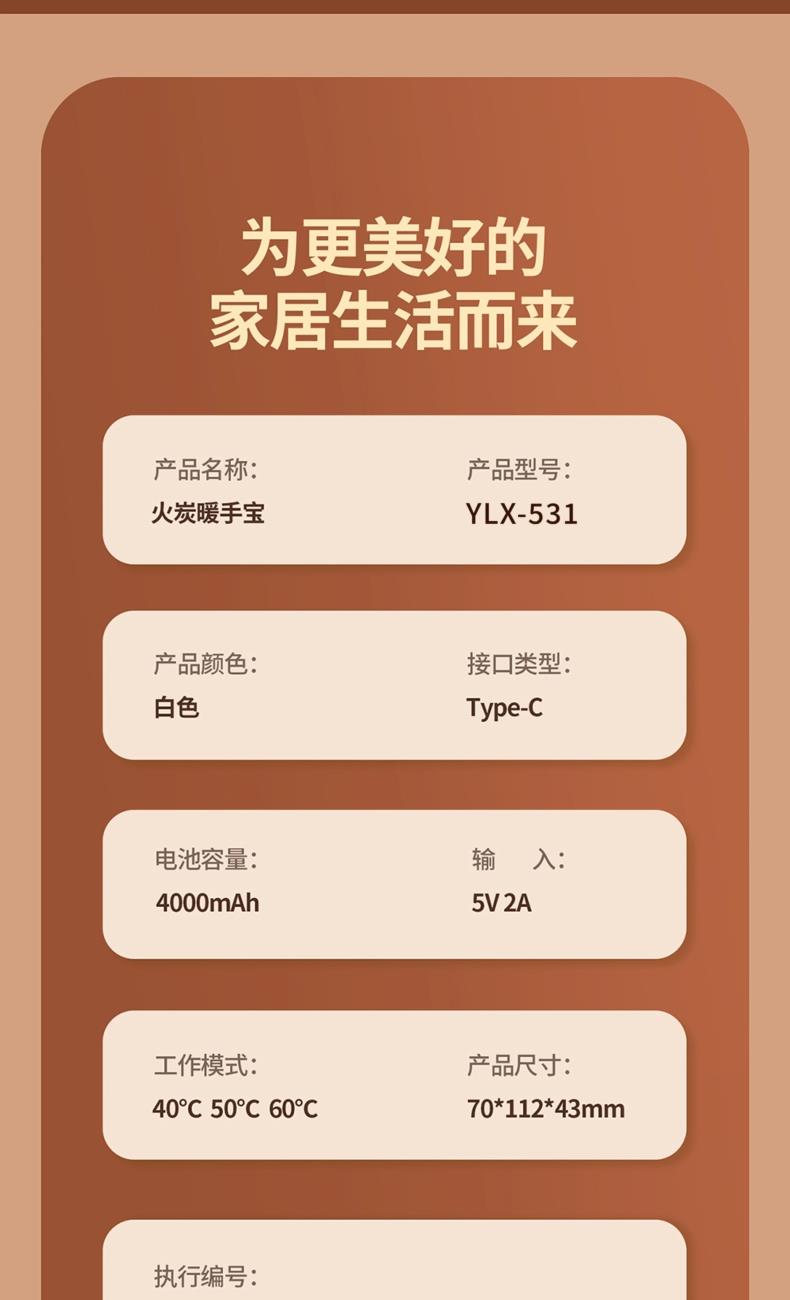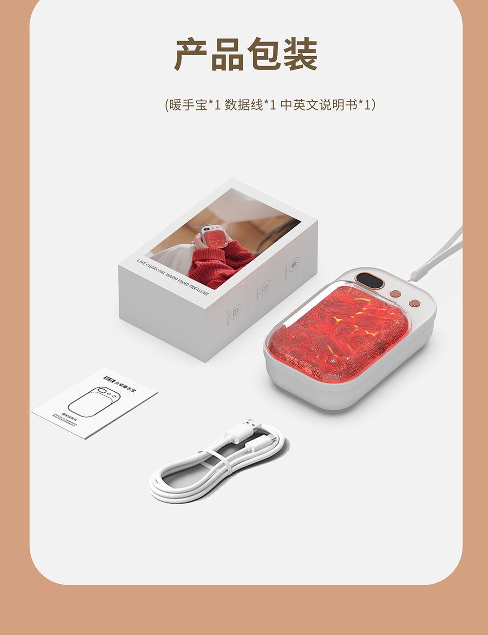 产品材质:ABS+PC+金属+电子元件 产品尺寸:11.2*7*4.3cm 产品颜色:白色 净 重:200g 输入电流:5V/2A 电池容量:4000mAh 功 率:5.5w 使用时间:3小时 产品特点: 小巧便携 随处可放 智能数显 实时电量 圆润外观 创意木炭 三档温度调节 满足多种需求